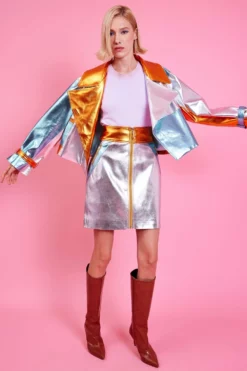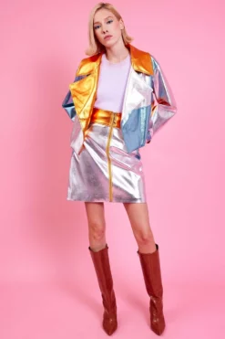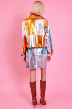 Super on-trend this metallic patchwork biker coat will give you the vibes you need throughout the cooler weather. The reflective, soft, faux leather features a belt, pockets and classic style collar.
