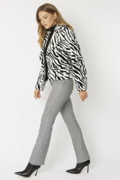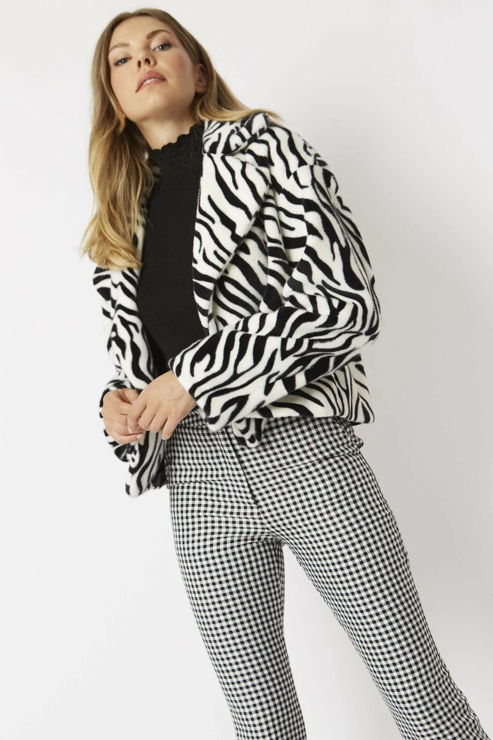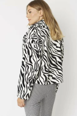 Tap into your wild side with this zebra print faux fur jacket from Jayley. Built in a relaxed fit that’s cropped to the hip. This jacket features a pointed collar and slouch shoulders.