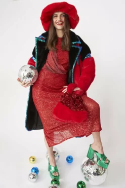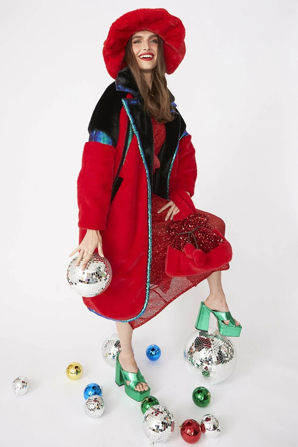 Elevate your festive look with this gorgeous oversized faux fur coat with sequin detail. Featuring a classic collar with sequin trim, drop shoulders and pockets.