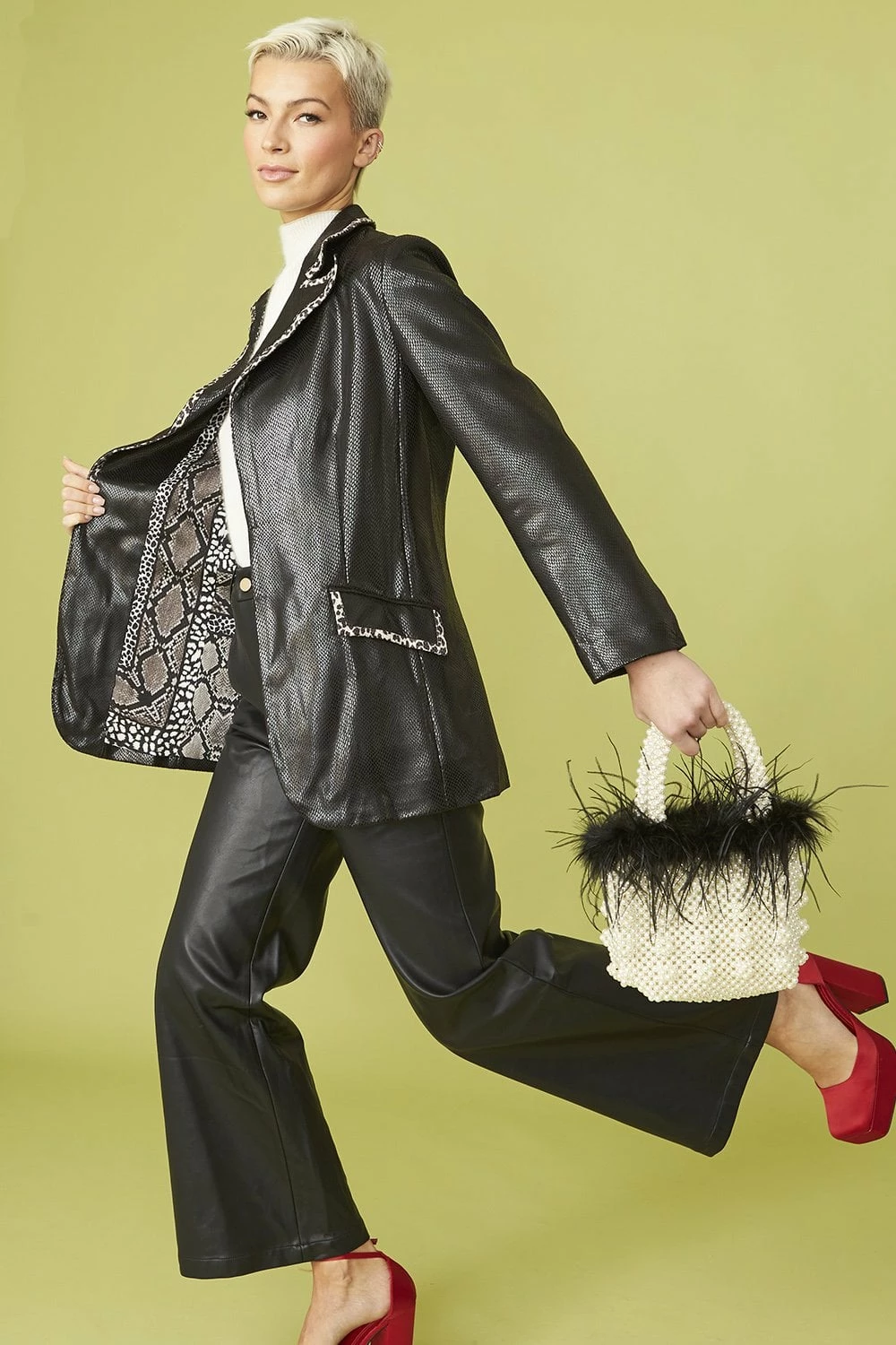 Step up your style game in our black eco leather animal print blazer. Cut in a regular fit, this blazer is double-breasted with two contact striped pockets and an open revere collar.
