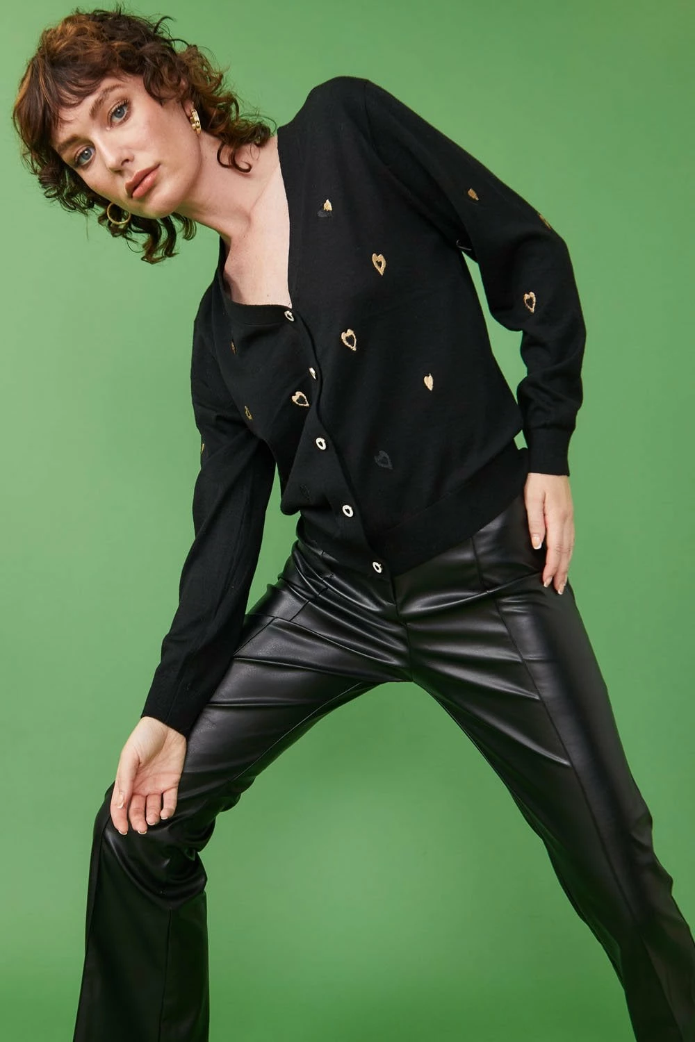 A classic design with a twist, our cashmere-blend cardigan has an attractive embroidered heart detail that is guaranteed to stand out. A lightweight, button-through construction with long sleeves, the slim fit design will flatter your figure. In a black and gold black colour combination it’s sure to become a staple piece in your wardrobe. Our cashmere is blended with an eco-friendly banana peel fibre to provide an incredibly soft feel.