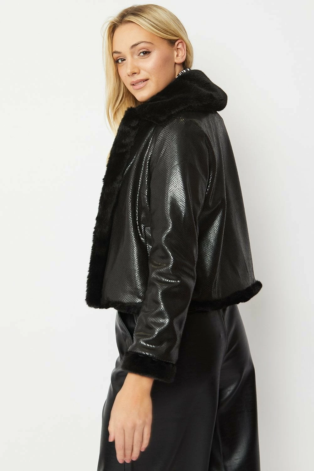 This faux suede jacket is the perfect outerwear piece for any occasion this season. It has been finished with a chic check print and a stunning faux fur trim; adding texture to your look. This jacket would look great styled with leather look trousers and a pair of your favourite boots.