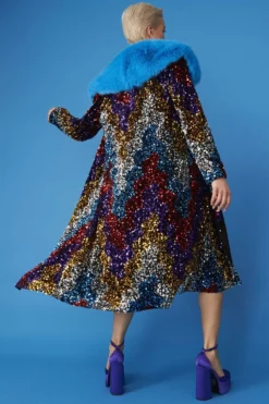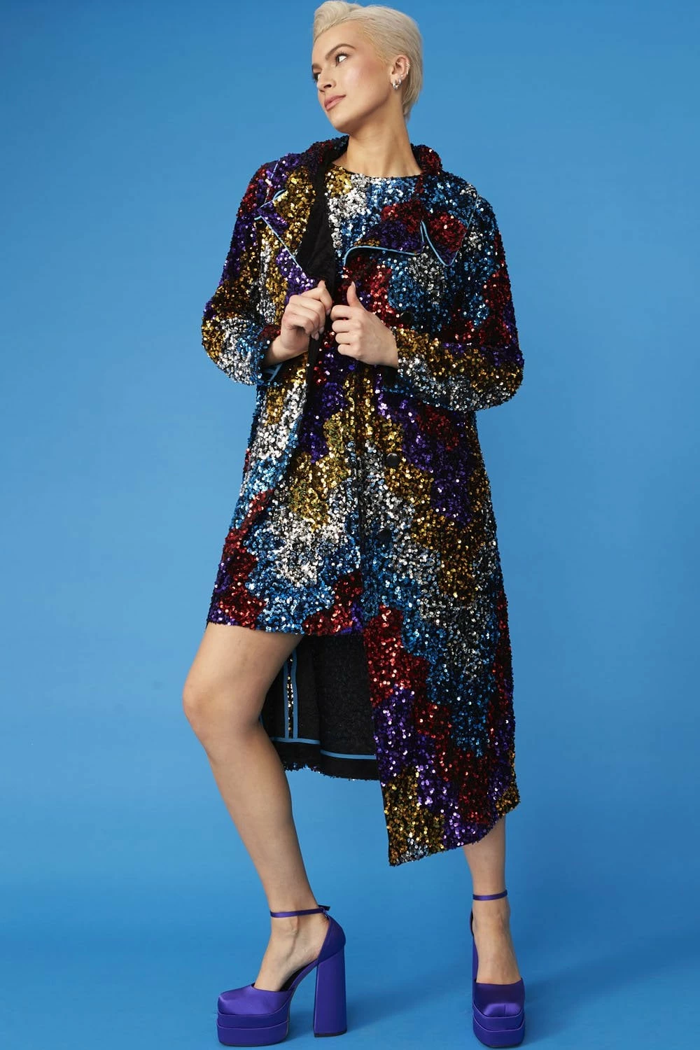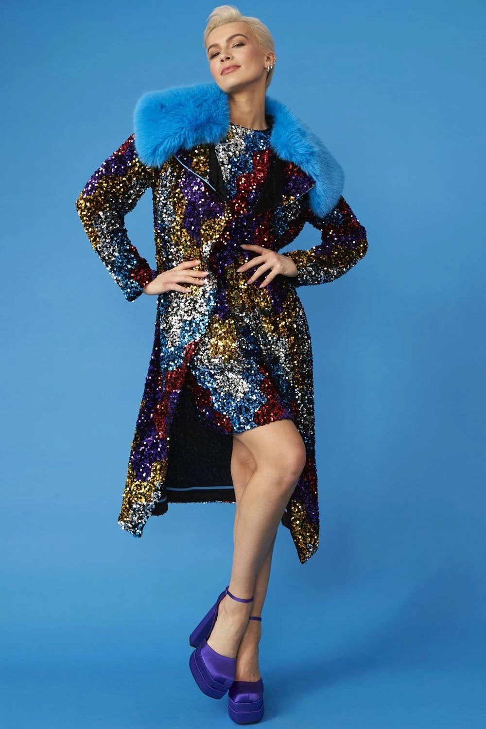So much more than just a trench coat. This trench coat is adorned with sequins, giving you a luxurious statement-making entrance, featuring a removable faux fur collar.