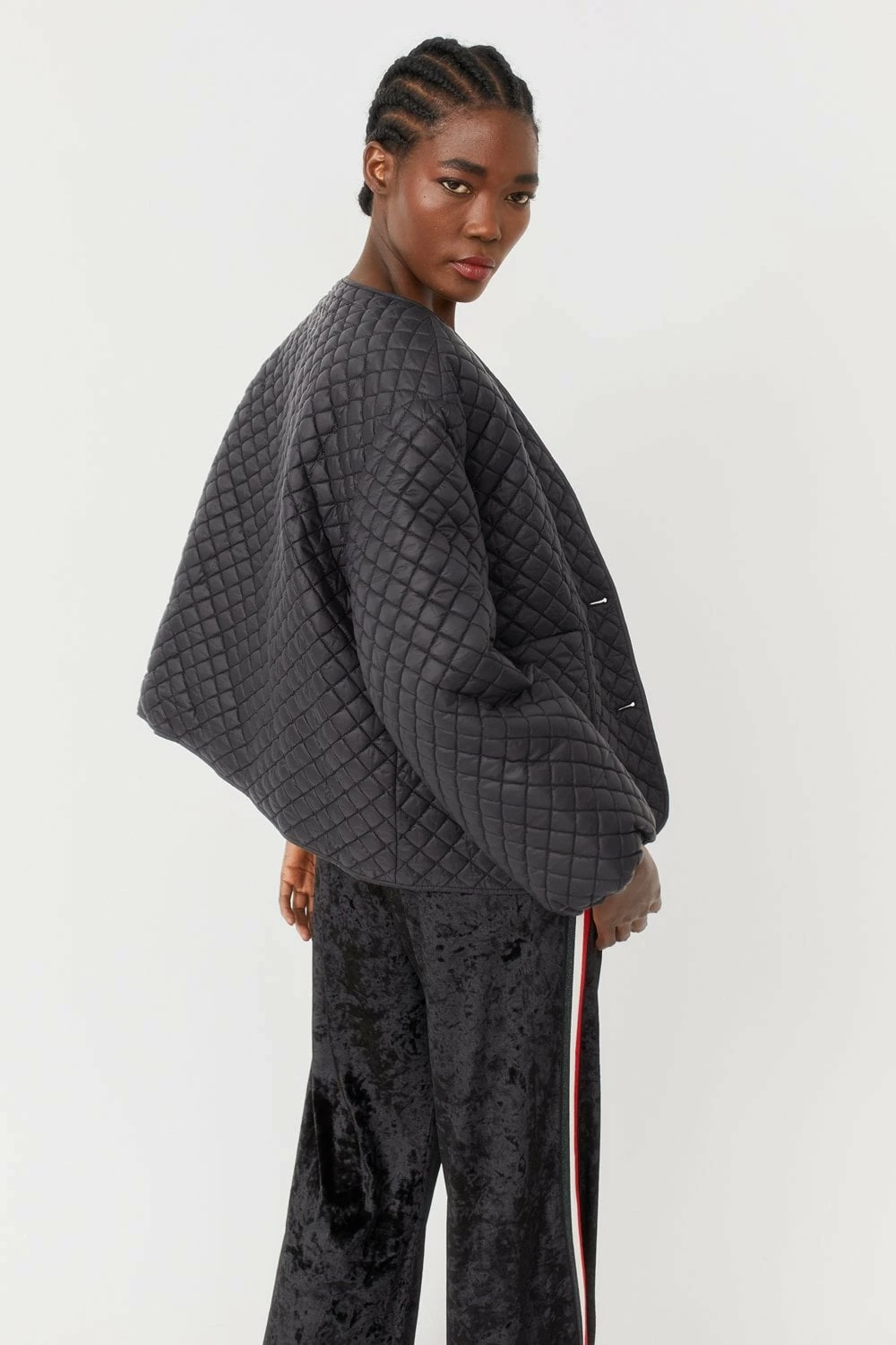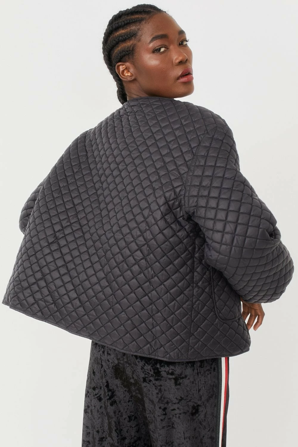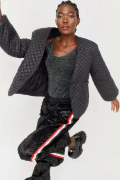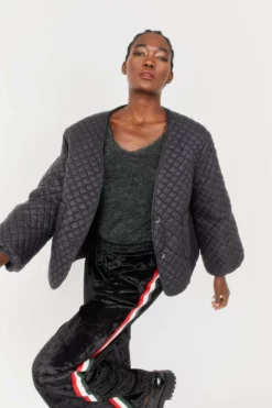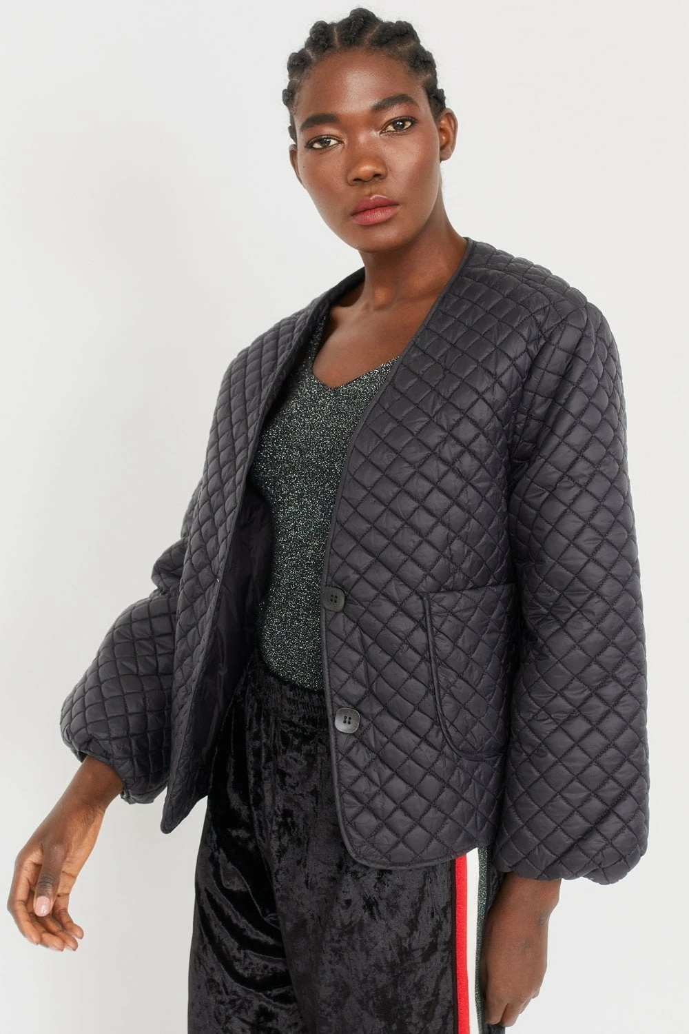 Perfect for everyday use, this lightweight quilted jacket features balloon style sleeves, a v-neck, side pockets and button fastening.