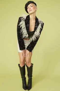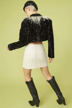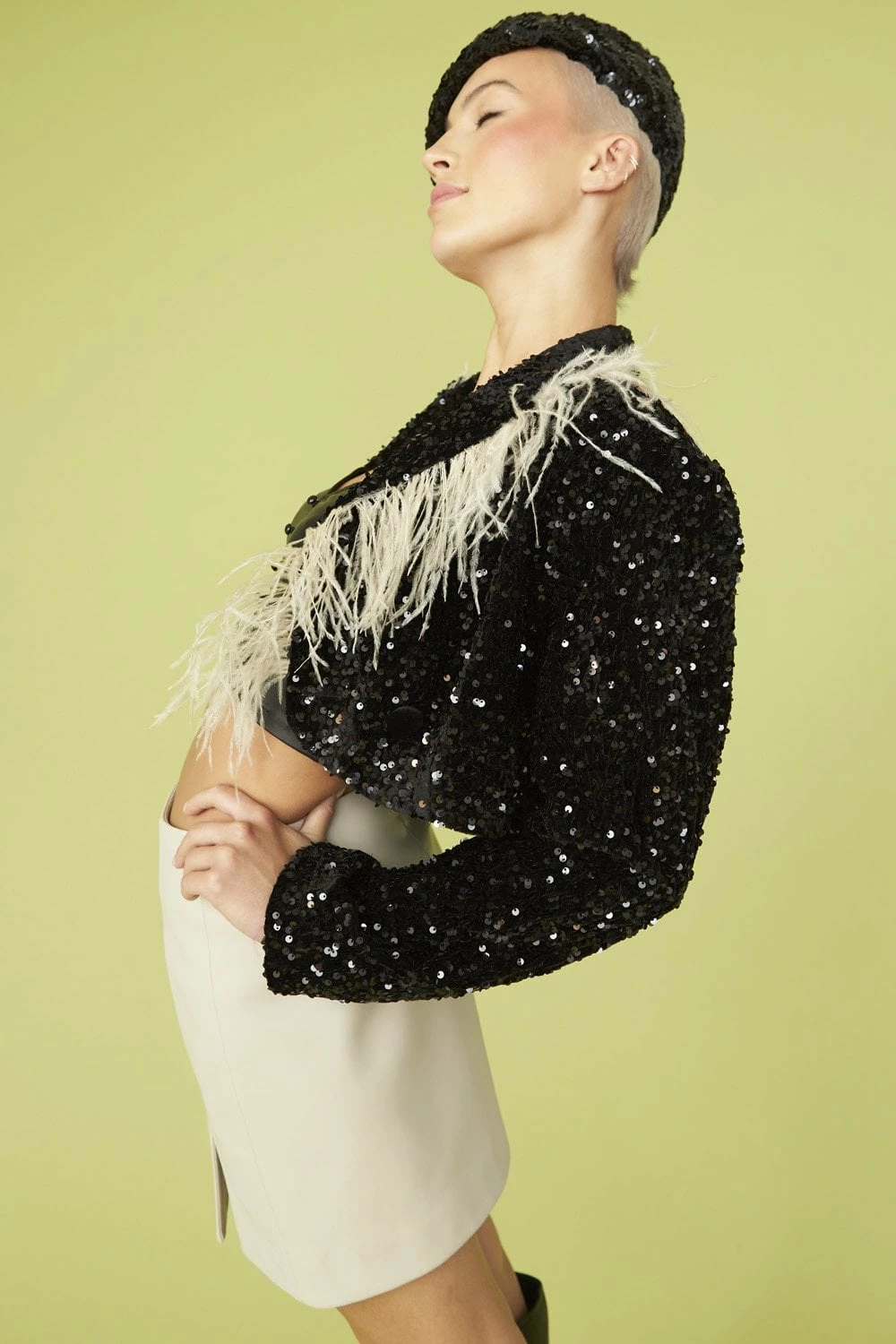 Stand out from the crowd with our sparkling black sequin cropped blazer featuring feather trim and silk lining. We just love how this instantly adds sparkle to your outfit, whether it’s with a tee and jeans for a day-to-night look!