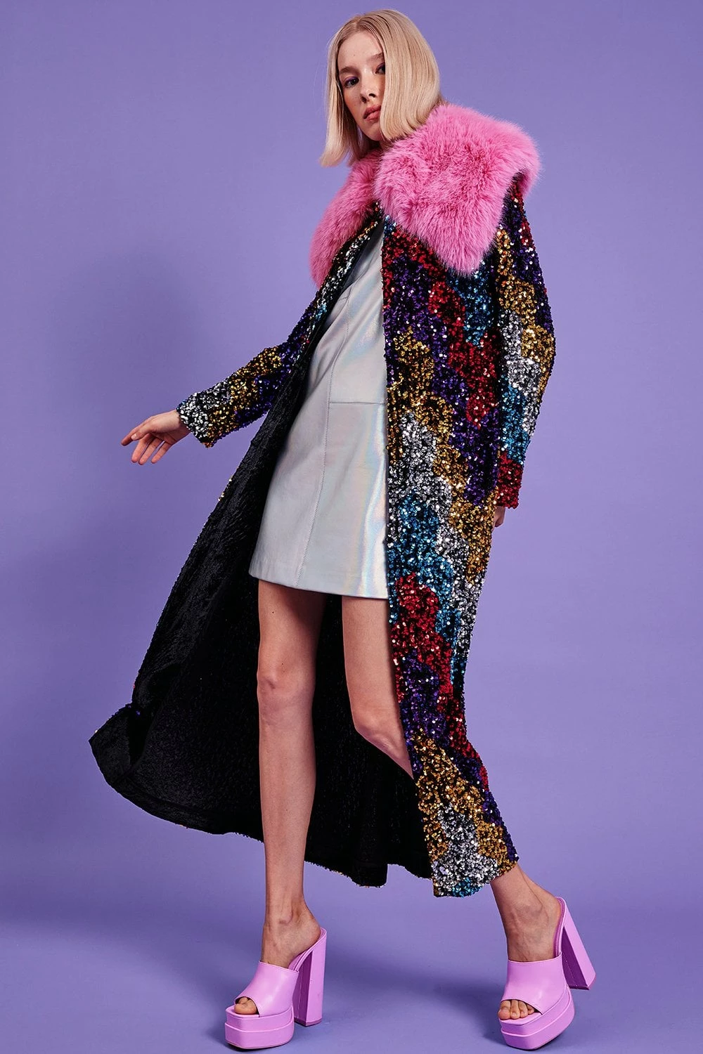 So much more than just a trench coat. This velvet trench coat is adorned with sequins, giving you a luxurious statement-making entrance, featuring a removable faux fur collar.