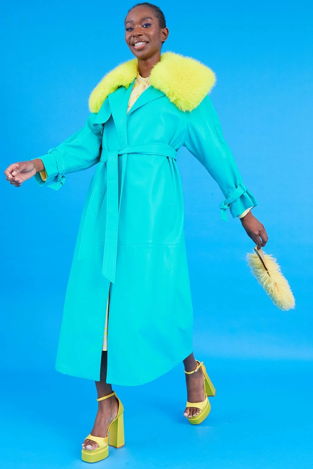 Super on-trend this blue maxi-style trench coat will give you the vibes you need throughout the cooler weather. Features a detachable faux fur collar and cuffs so you get two looks for the price of one!