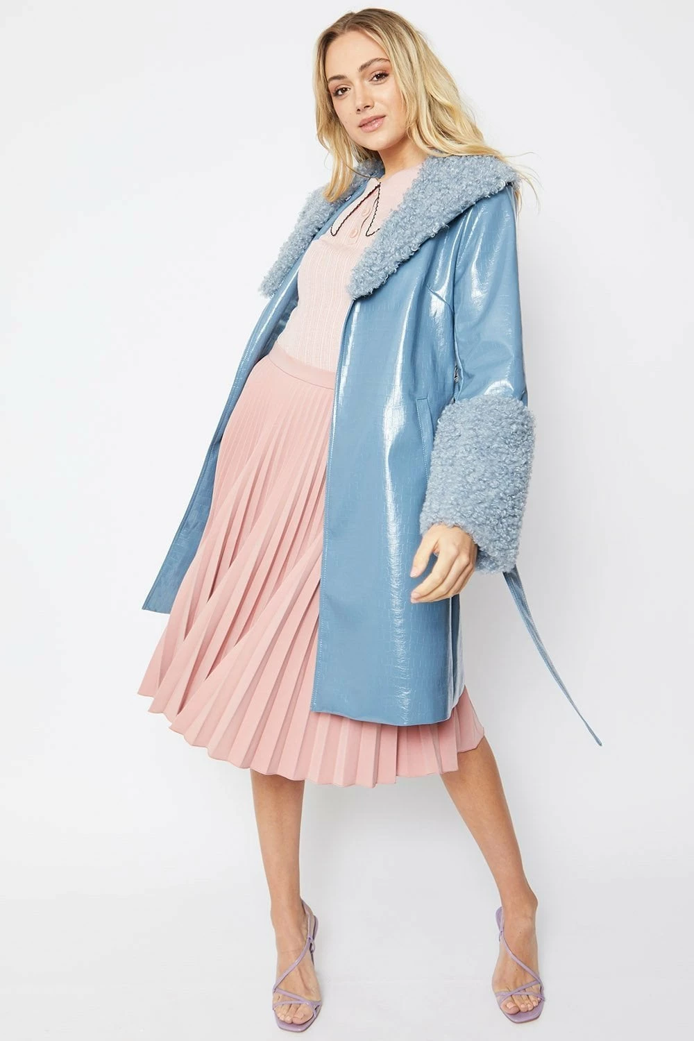 The most gorgeous faux suede coat with faux shearling detailing. We know you’ll be obsessed! Our faux suede coat with subtle check print features luxuriously soft faux shearling cuffs and a collar with a belt and side pockets.