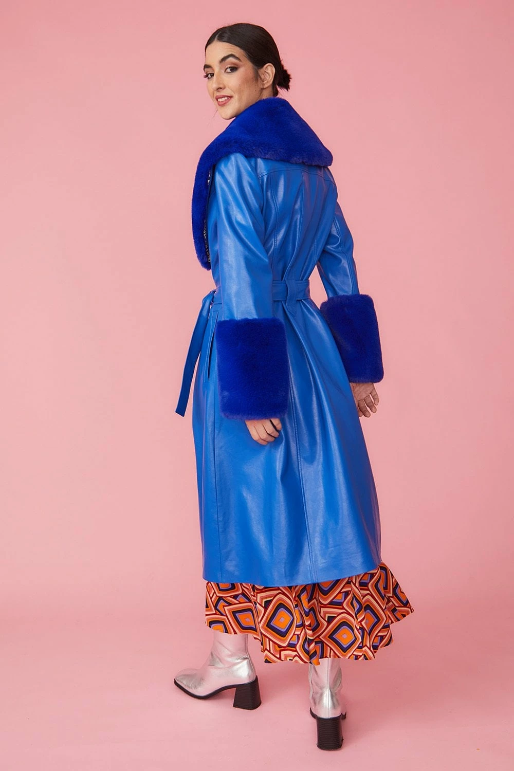 Super on-trend this blue midi style trench coat will give you the vibes you need throughout the cooler weather. The brushed, soft, faux leather is embossed with snake print and features a yellow detachable faux fur collar and cuffs so you get two look for the price of one!