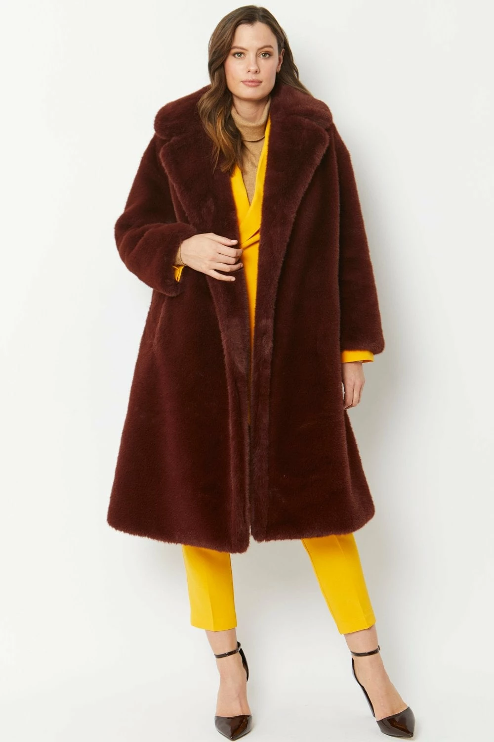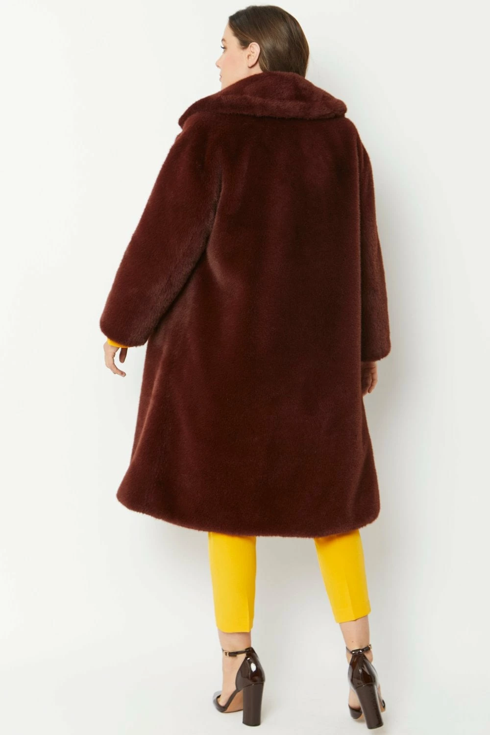 Snuggle up in this oversized faux fur brown midi coat with pockets. A real comfy piece that features full faux fur lining for extra warmth while being practical and perfect for pairing with your more casual outfits.
