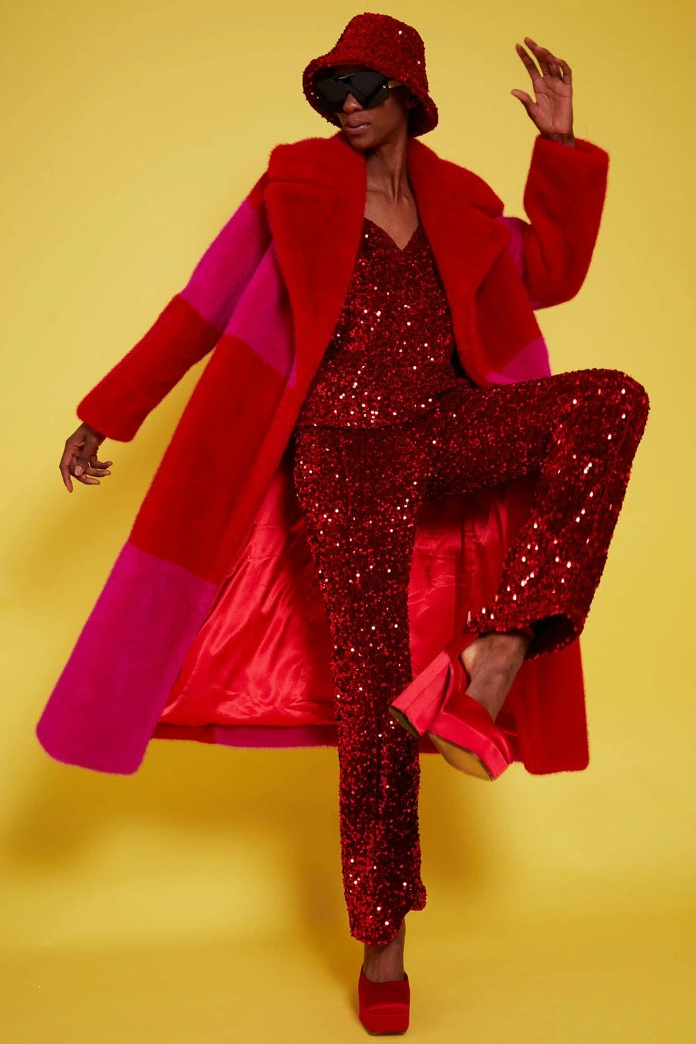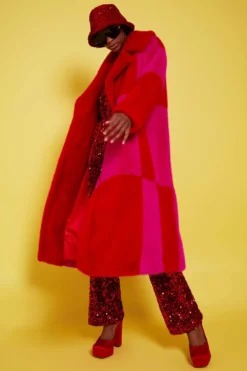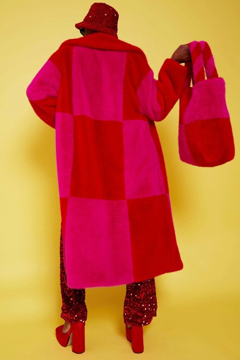 Style and warmth go hand in hand with this faux eco-friendly bamboo knitted coat. In two-tone pink, this incredibly textured jacket features in-seam pockets and large statement buttons. It comes in an oversized fit so that you can add layers underneath.