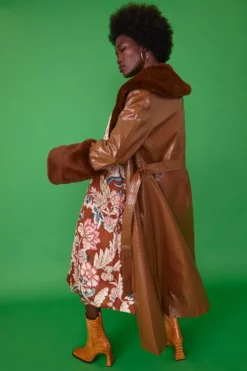 Our beloved Faux Leather Coat in chocolate brown with Detachable Faux Fur Detailing is back with a longer length upgrade. We know you’ll be as obsessed as we are. Our shiny faux suede coat with subtle animal print features luxuriously soft faux fur cuffs and a collar with side pockets its’ the perfect piece in any season.