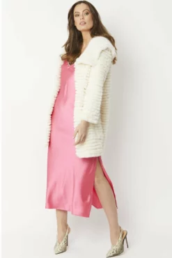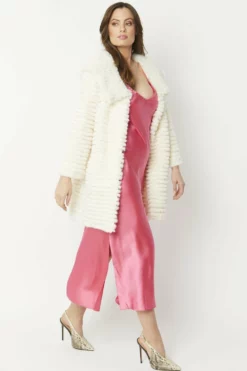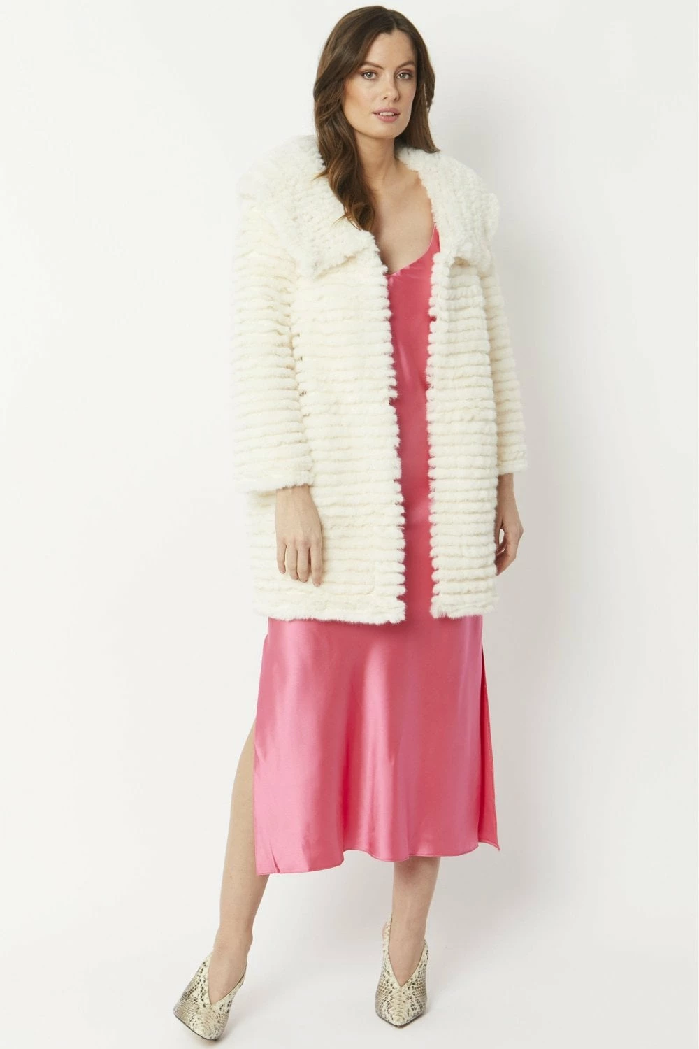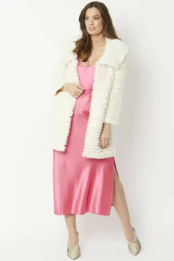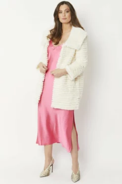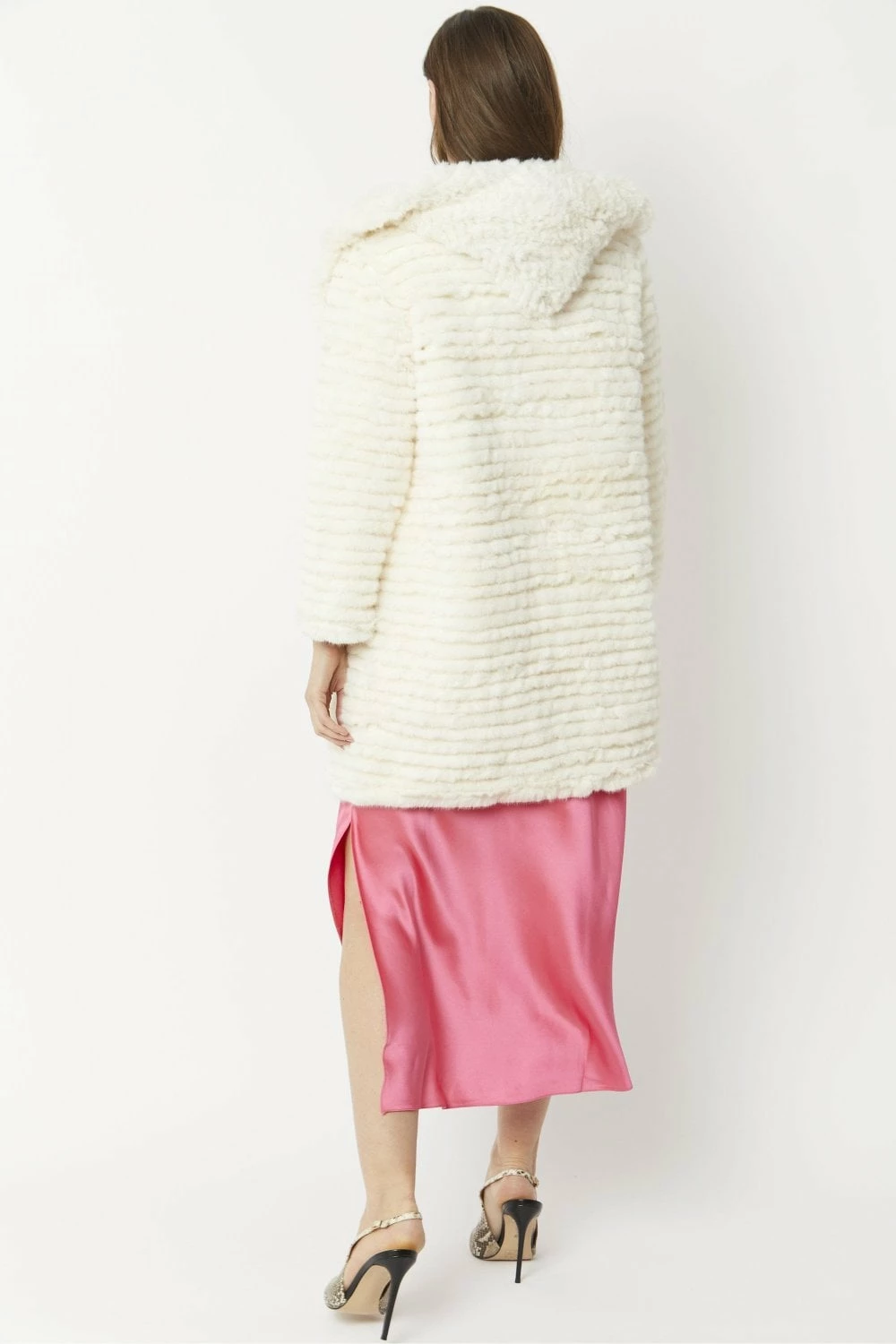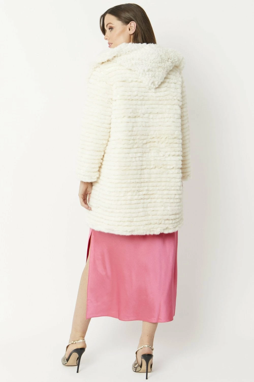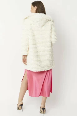 Give into plush textures with this gorgeous A-line coat made from the finish of faux mink fur. Super soft and perfect to take you from day to night, this coat features a funnel neckline with long sleeves, oversized hood and collar, cosy side pockets and fastened with hook and eye.