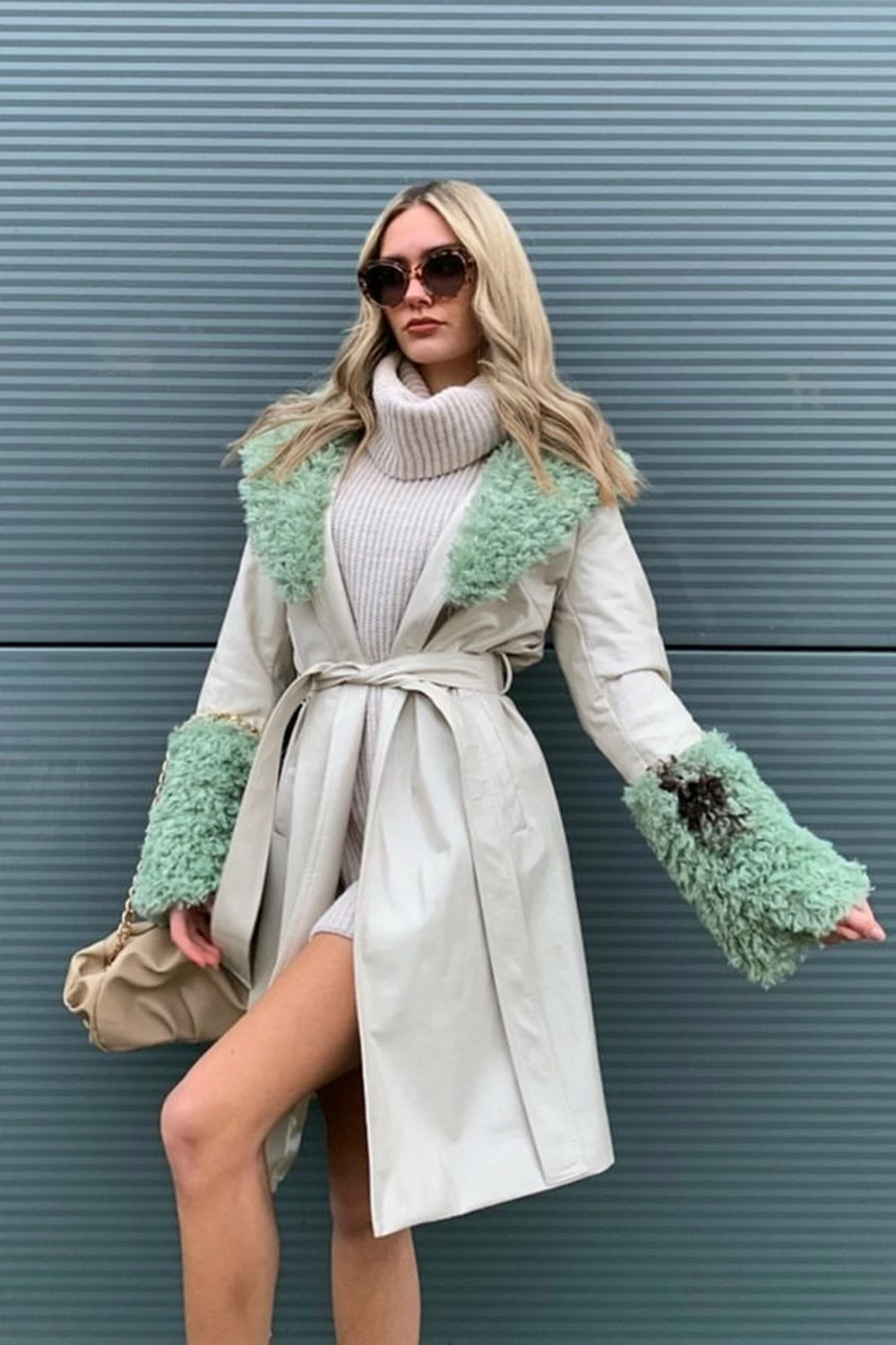 The most gorgeous faux suede coat with faux shearling detailing. We know you’ll be obsessed! Our faux suede coat with subtle check print features luxuriously soft faux shearling cuffs and a collar with a belt and side pockets.