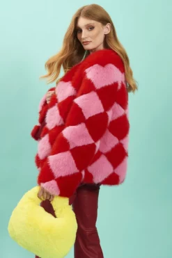 Our pink and red diamond check jacket made from the finest faux fur is a real statement piece. Beautiful and bold this sumptuously soft coat will keep you warm and in style throughout the cold winter months.