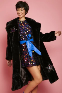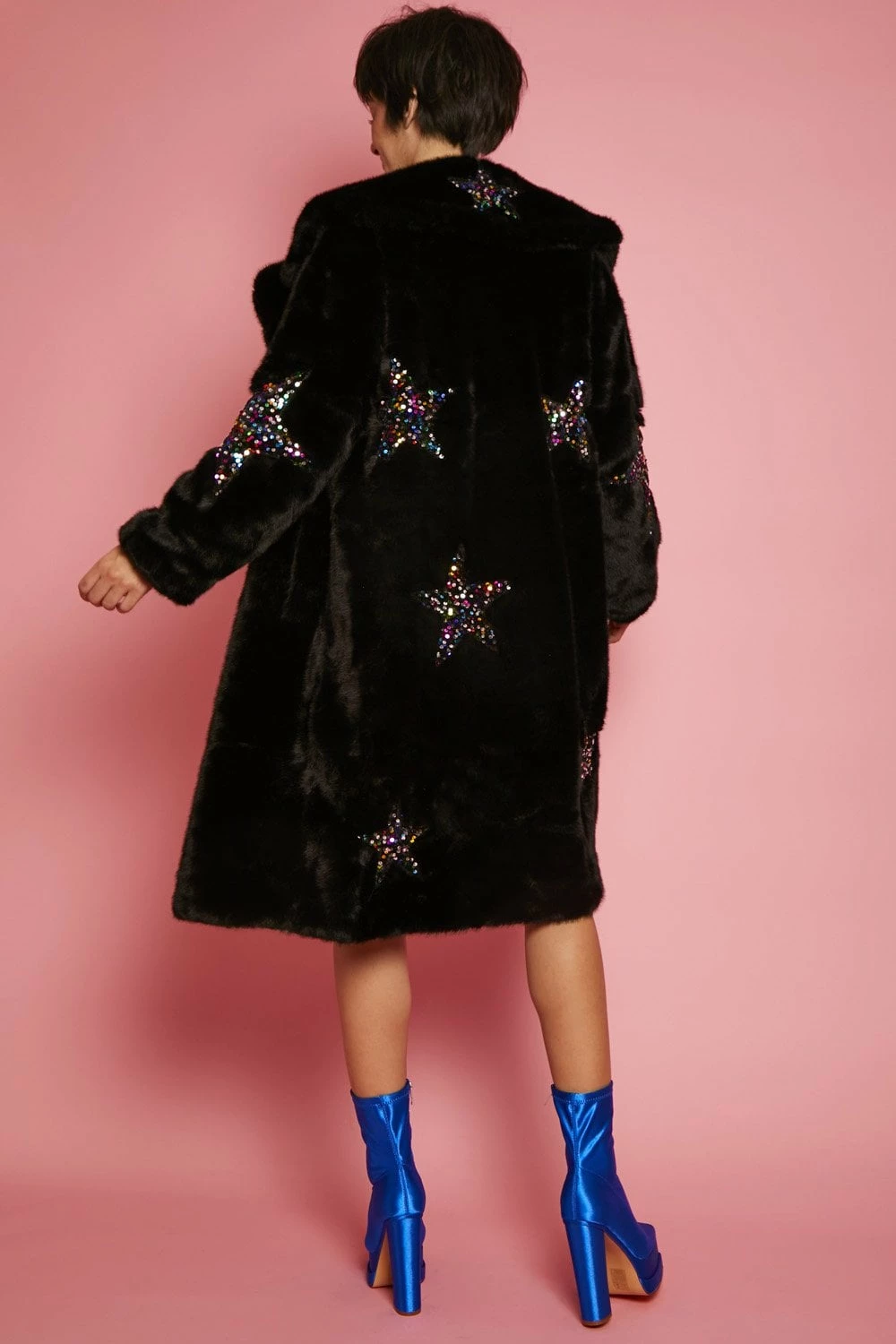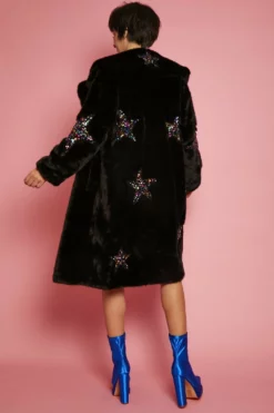 Our coat is from our 100% sustainable collection. Crafted from Bamboo, which is incredibly soft and flexible so no steaming! This coat features a crew neckline, relaxed, longline silhouette, long sleeves, and star sequin detail. Rock yours over skirts, straight-leg mom jeans, or your favourite co-ord. The perfect coat for all occasions!