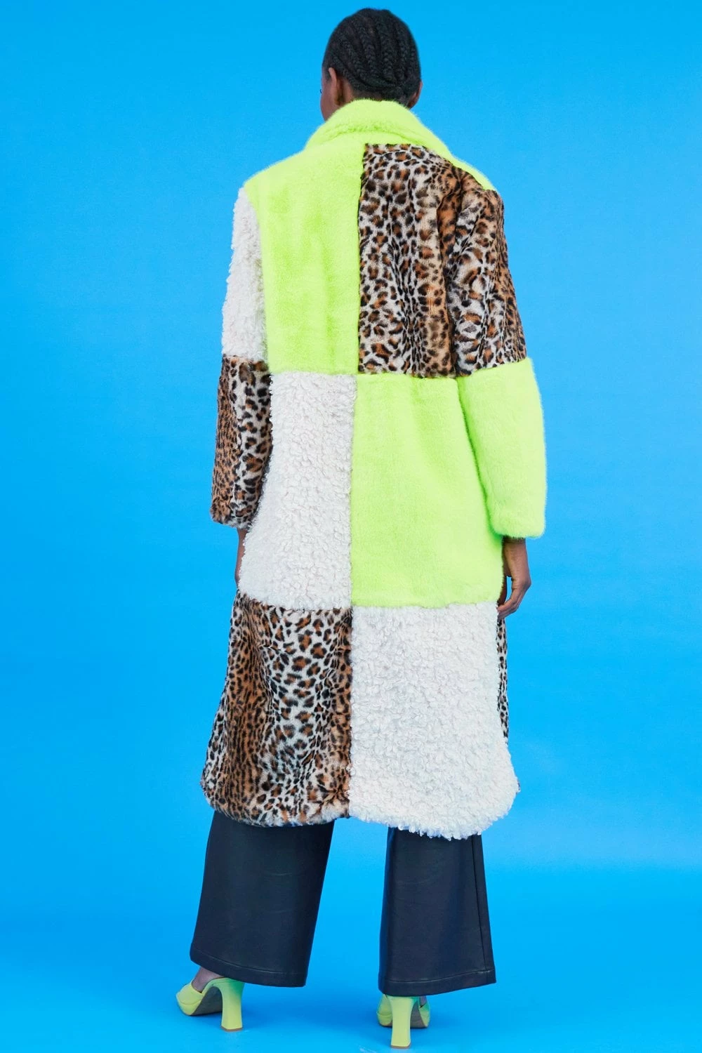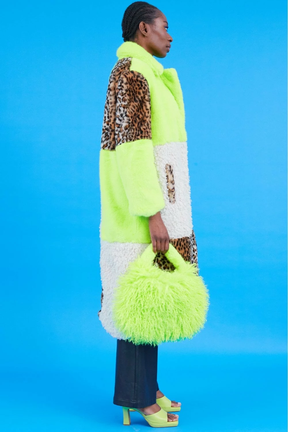 Who doesn’t love animal print and when combined with a bright bold green and white shearling, it’s easy to see why our latest arrival is such a big hit. This coat features an extra fluffy faux fur collar in bright blue, oversized classic lapels, pockets, leopard print and Shearling Check Design and full silk lining.