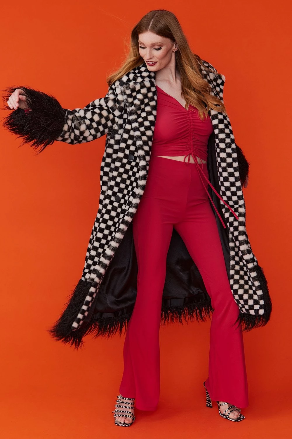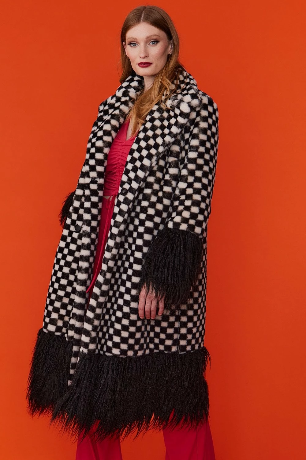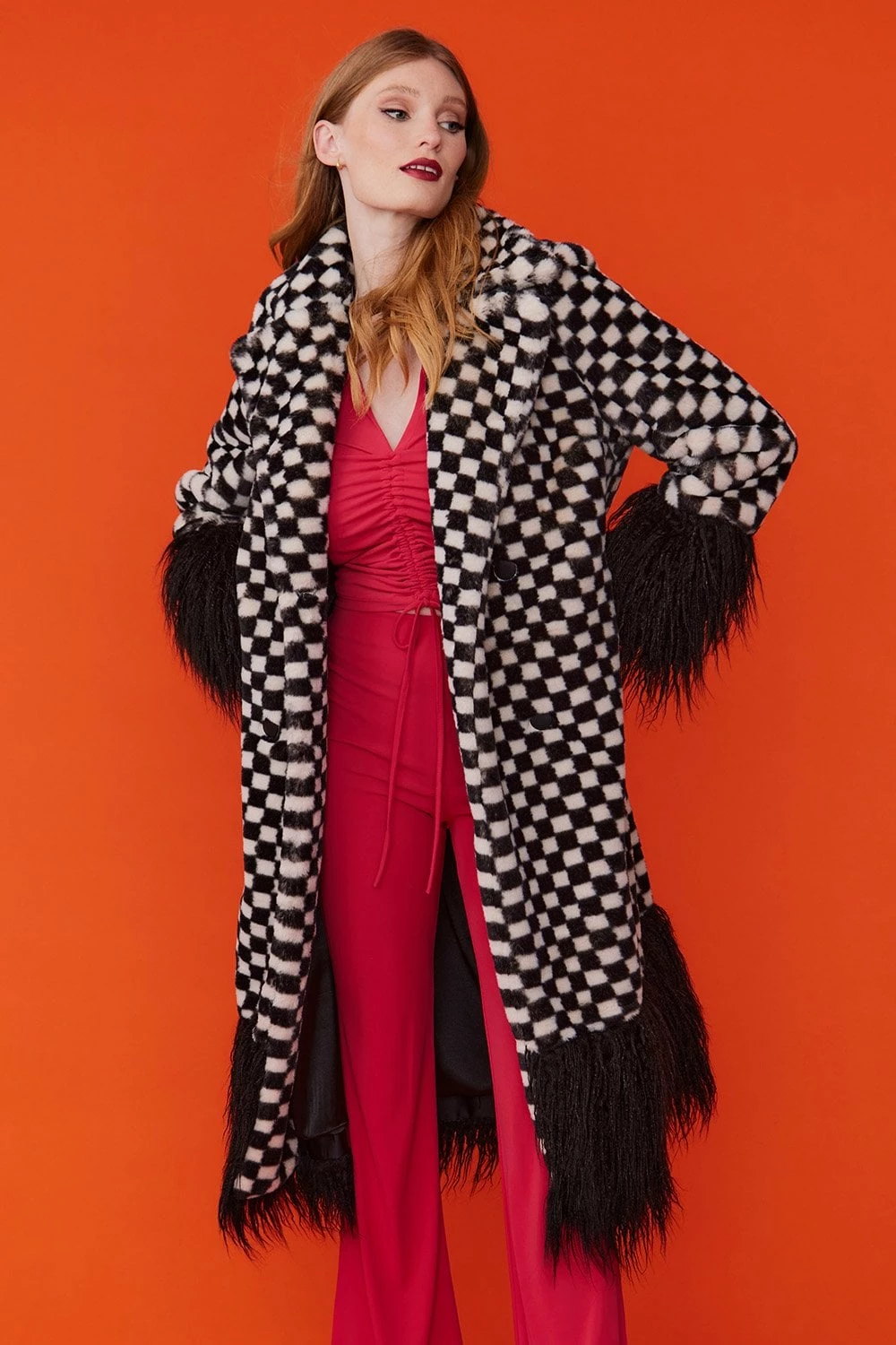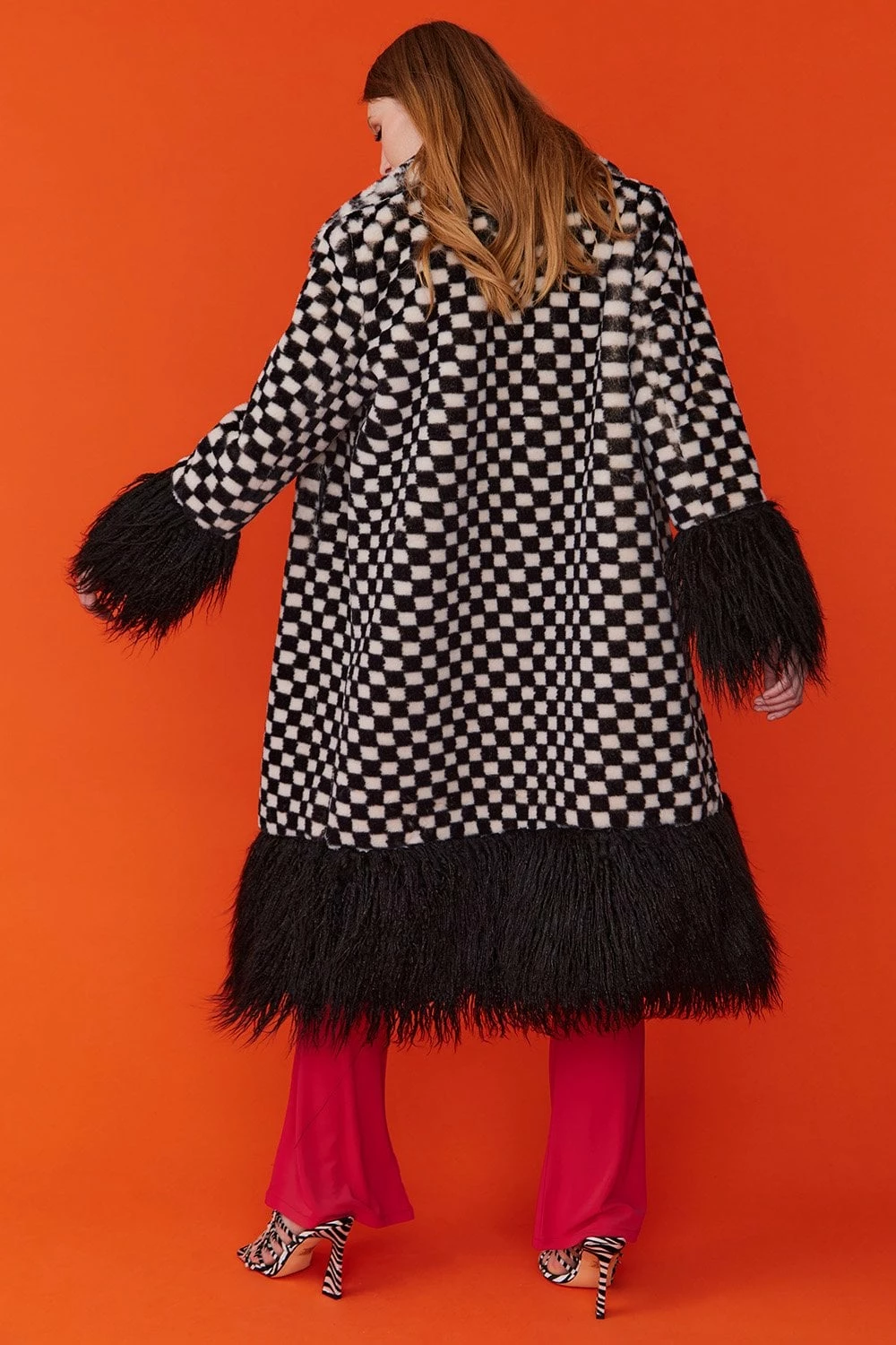 This faux fur maxi coat in white and black checkered print boasts luxury and style. With a subtle green hue to the check, it’s truly a one-of-a-kind piece. This coat features pockets, and a classic style fluffy collar.