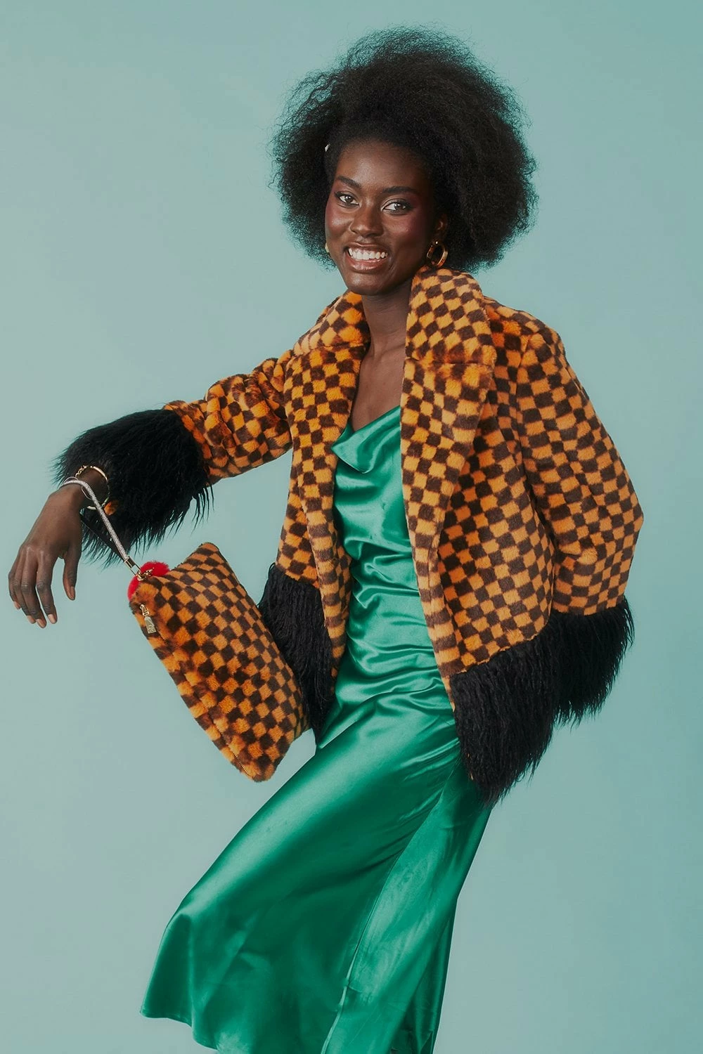 For supreme style and comfort, look no further than this sumptuously soft faux fur coat. A twist on our classic checkered collection, this coat gives an eye-catching edge and provides a statement look with exageratted Mongolian fur cuffs and trim.