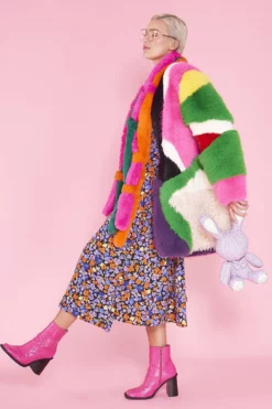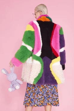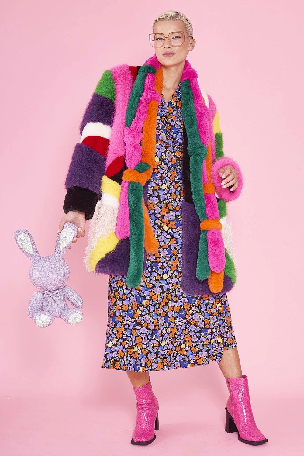 Expertly crafted from the finest faux fur, this midi coat is beautifully designed with a blocked rainbow pattern. Accompanied with deep side pockets and hook and eye front fastening this coat is a real statement piece.
