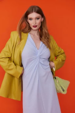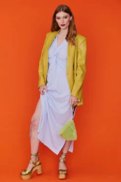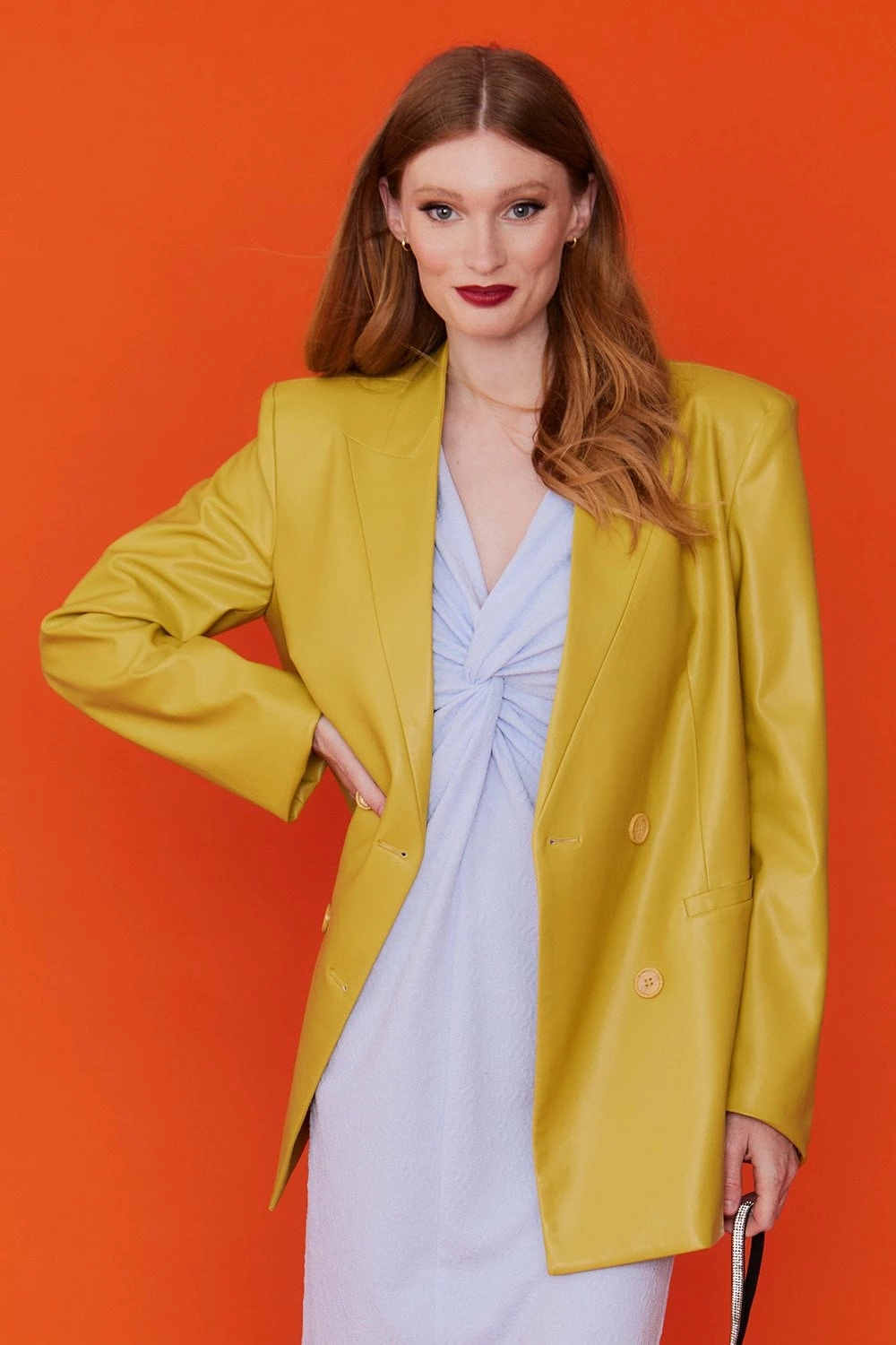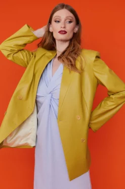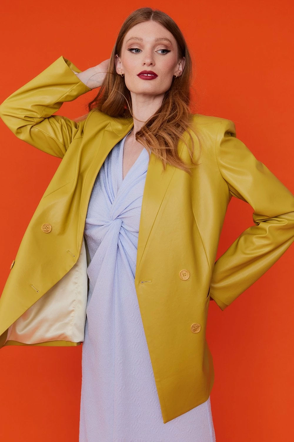 This blazer is sure to add an edge to your look. Featuring a dark yellow straight-cut, double-breasted blazer in soft eco-leather. Relaxed fit with welt front pockets with faux lapels.
