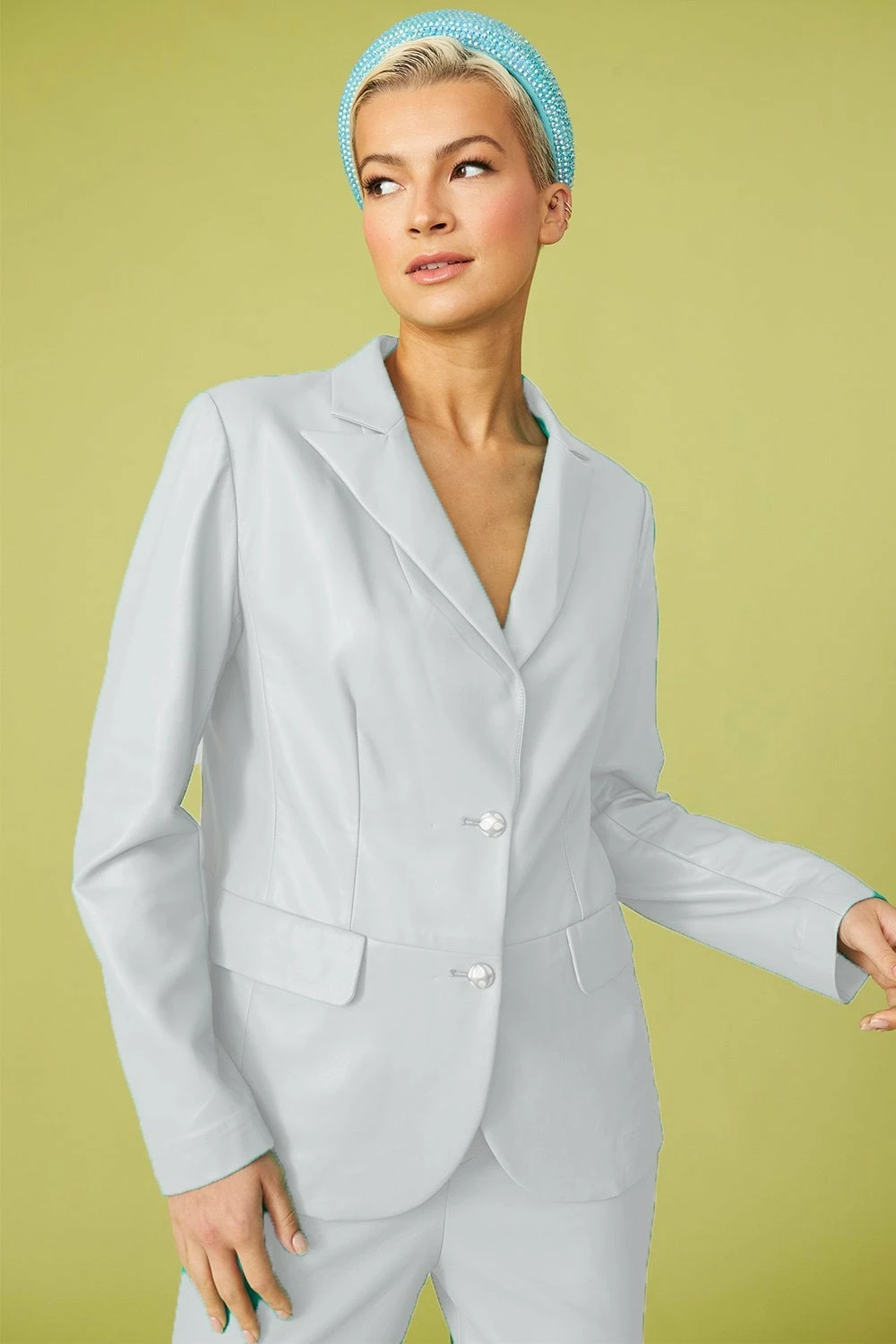 Follow the latest trends with our Faux leather Kate Blazer has a gorgeous metallic finish with press stud Fastening.