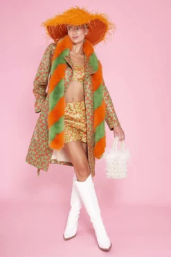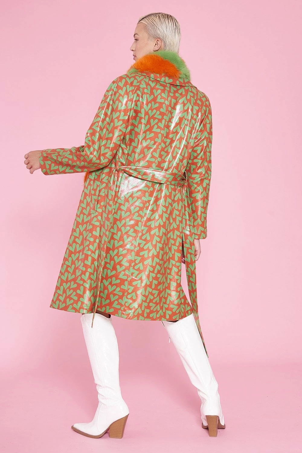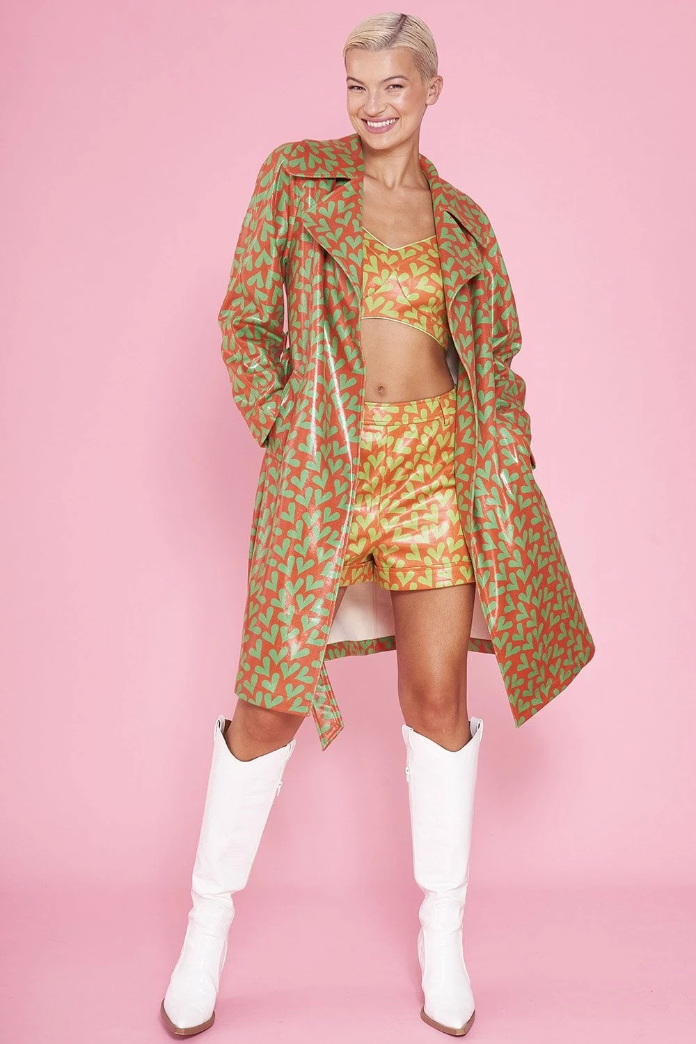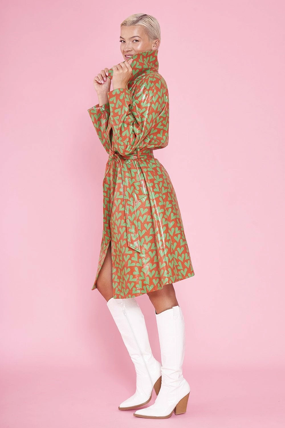 Keep toasty this season with our new heart print trench coat. Featuring peaked lapels, a tie waist belt, and two front pockets. The trench coat also features full-length sleeves and a super soft faux suede touch. This coat is effortlessly versatile and is the perfect piece to take you from day to night.