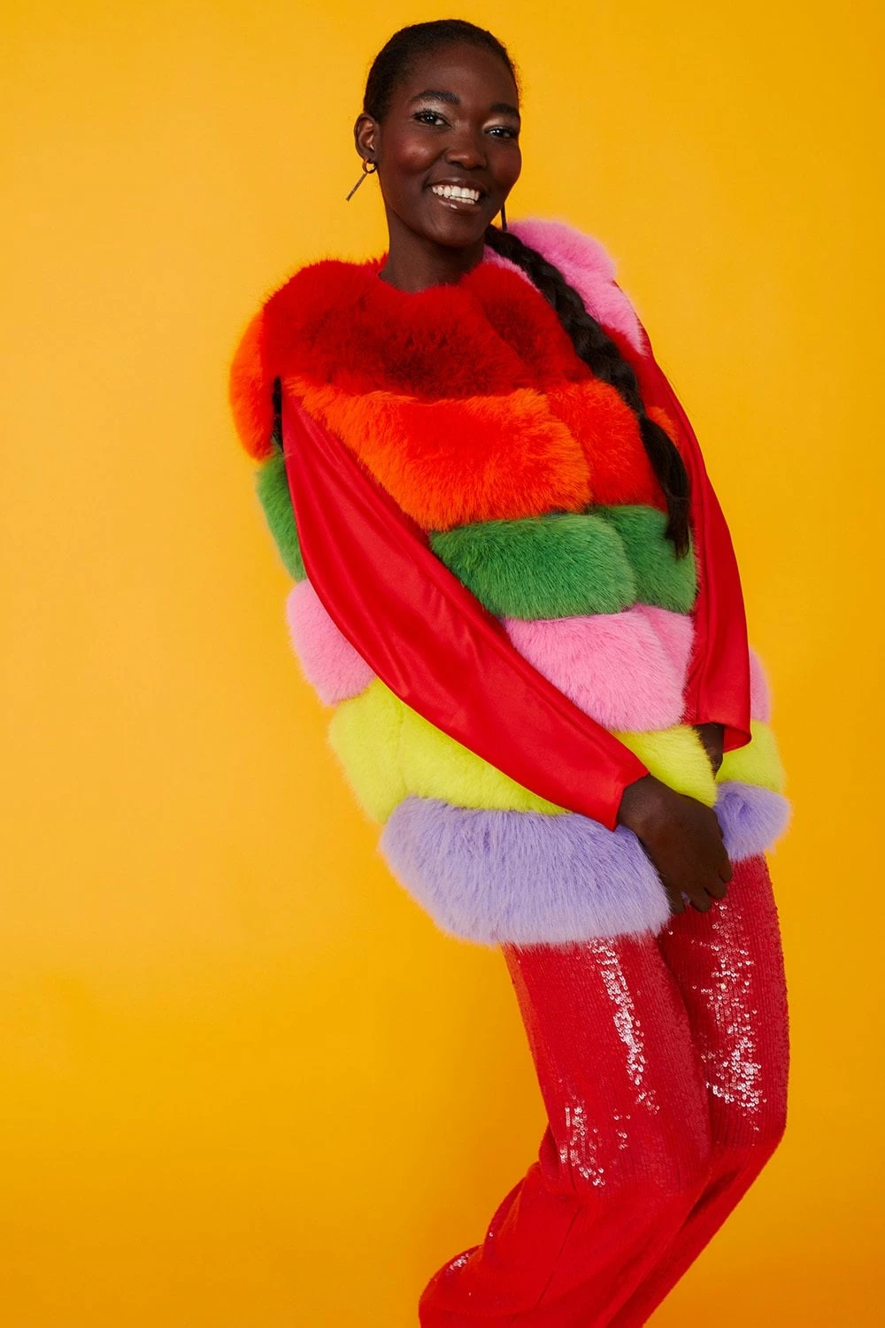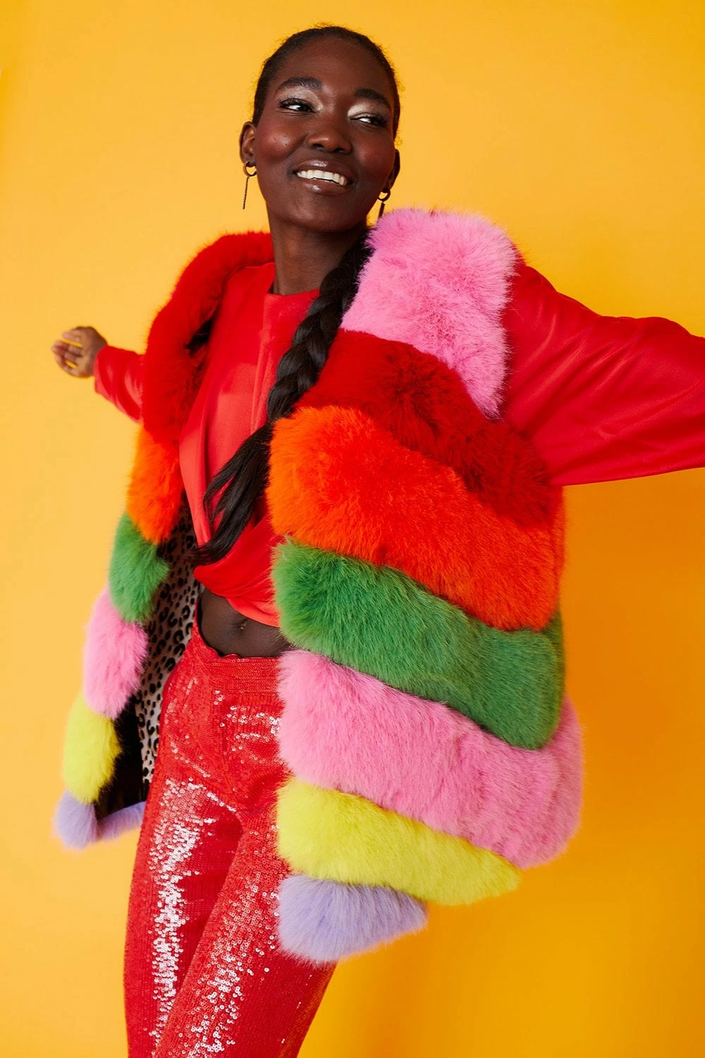 Expertly crafted from the finest faux fur, this faux fur Gilet features diagonal panelling in a rainbow of colours. Accompanied with deep side pockets and hook and eye front fastening this gilet is a real statement piece.