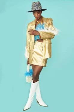 Double-breasted, eco-leather blazer with feather trim. We love how fun this blazer is. It features full feather sleeve trim details, pockets and full lining.