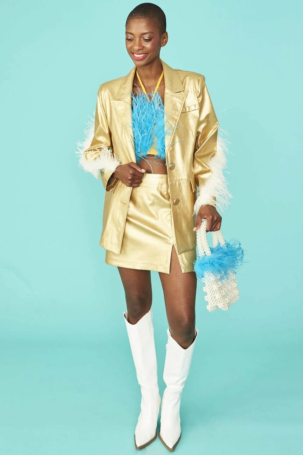 Part of our metallic collection this mini skirt co-ord featuring a split is crafted from our gorgeous eco-leather