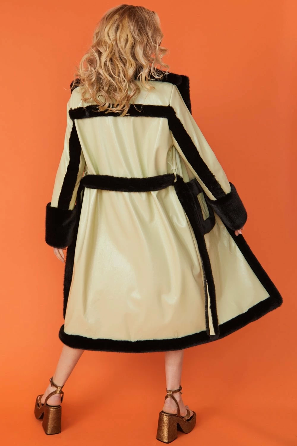 Look effortlessly stylish in this black faux leather jacket with green and black faux fur detail. Featuring oversized pockets with matching trim and a leopard print inner lining this piece is sure to make a statement. The versatile maxi length will compliment any outfit and the snap buttons make it practical and snug.