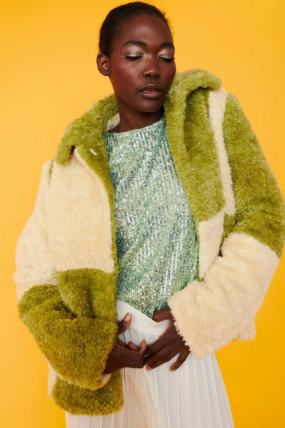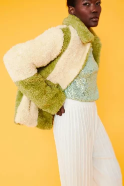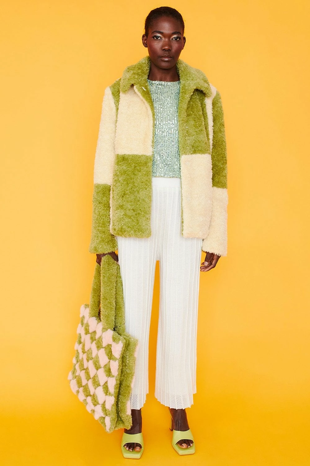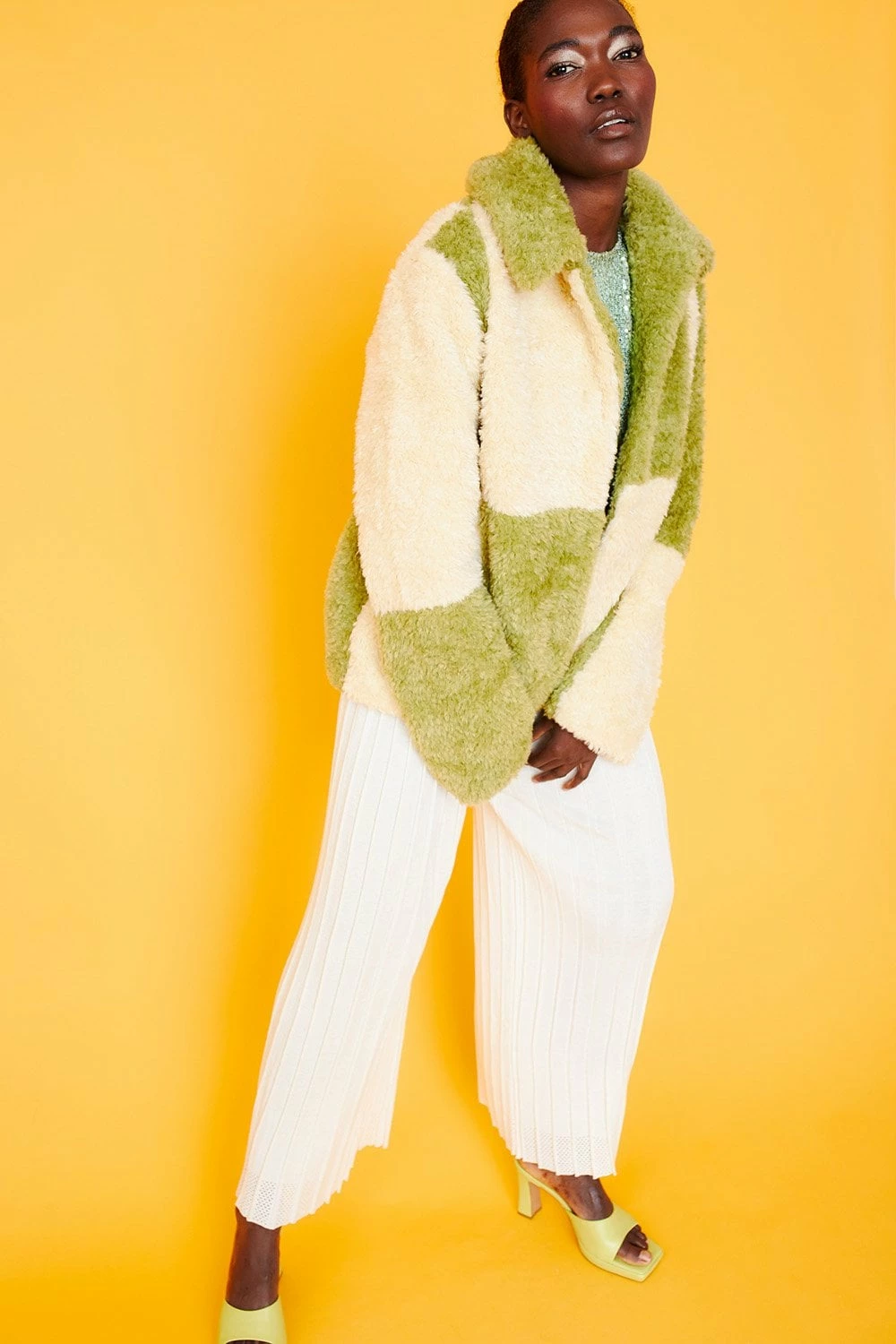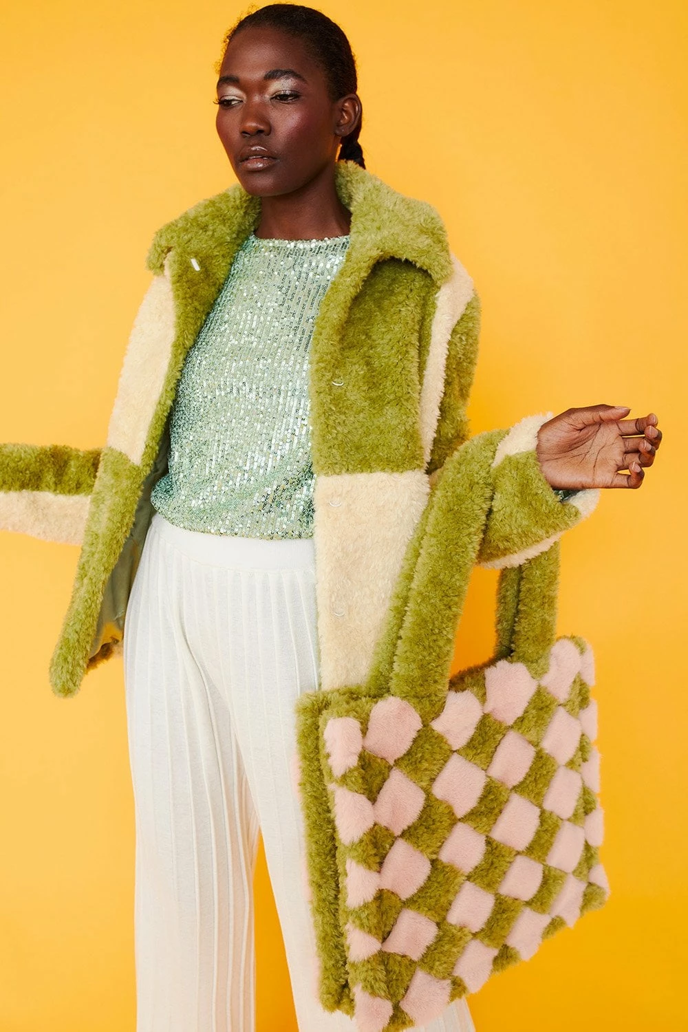 Style and warmth are two of the key features of this fluffy big check monochrome jacket. Made from faux shearling with a collar, pockets, and hook and eye closures.