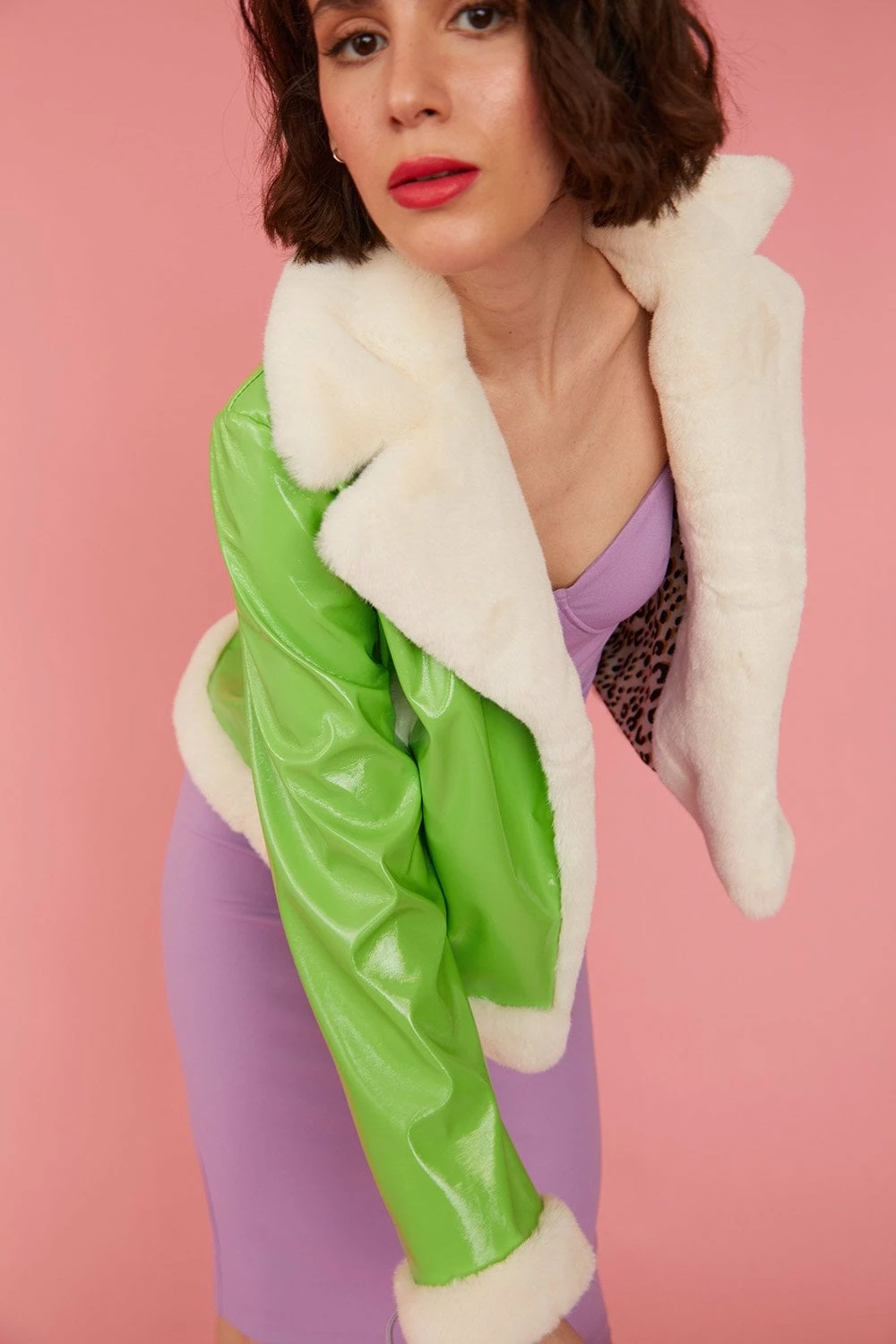 Stand out from the crowd in this black faux patent leather Aviator style jacket and turn heads wherever you go. The flight jacket may be classic in style but the faux fur trim gives it a modern twist. Featuring press stud closures, pockets that are a feature in their own right, and a leopard print lining that gives an added flash of pattern.