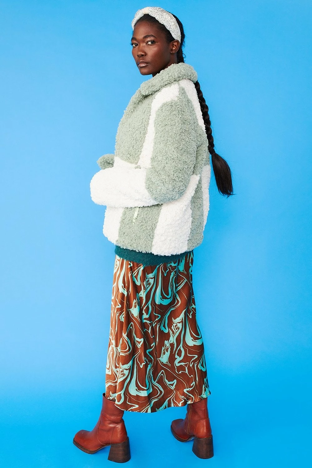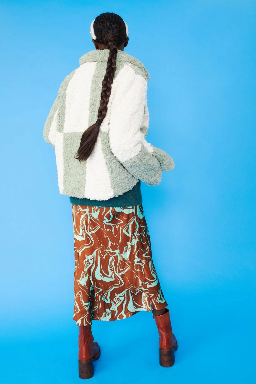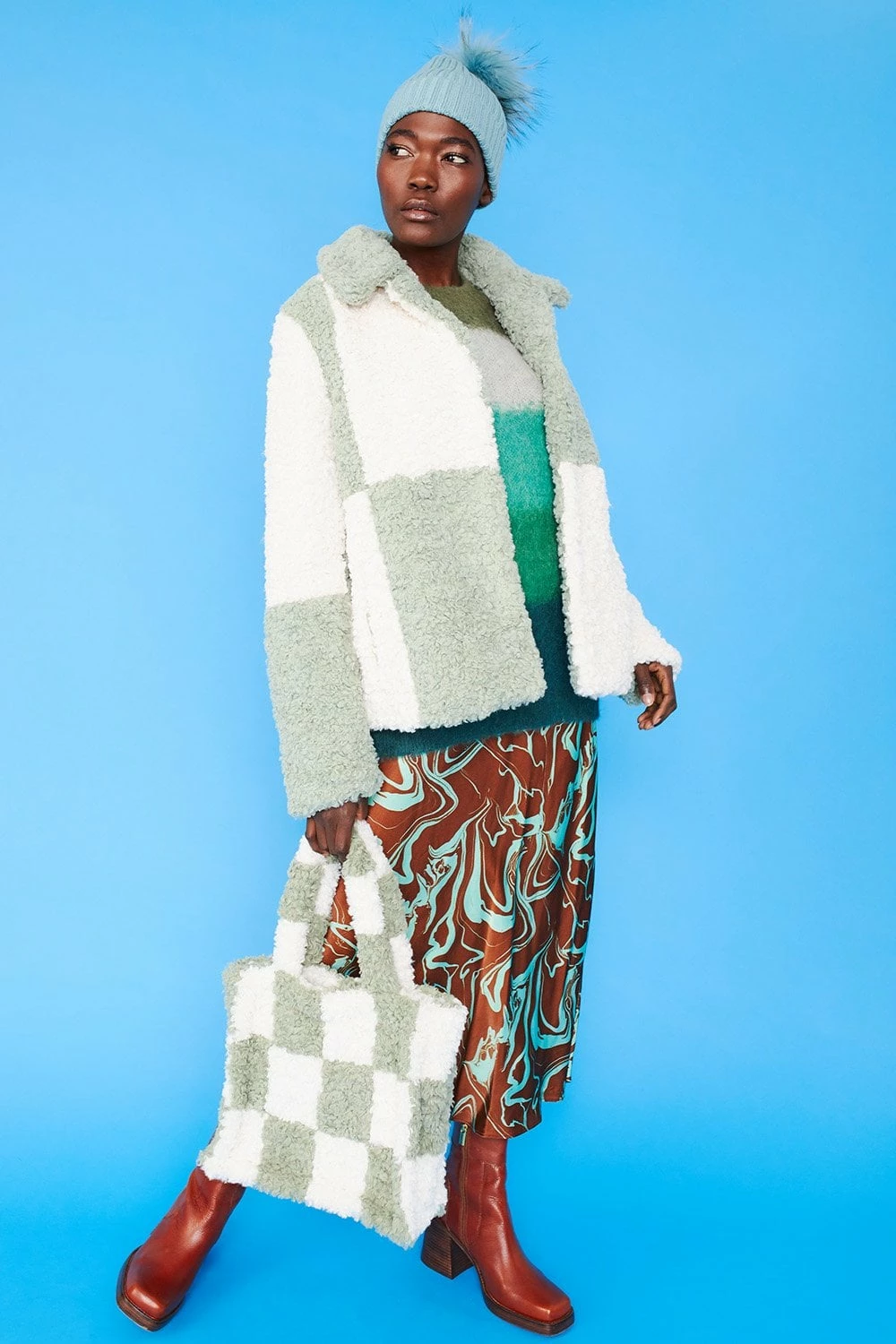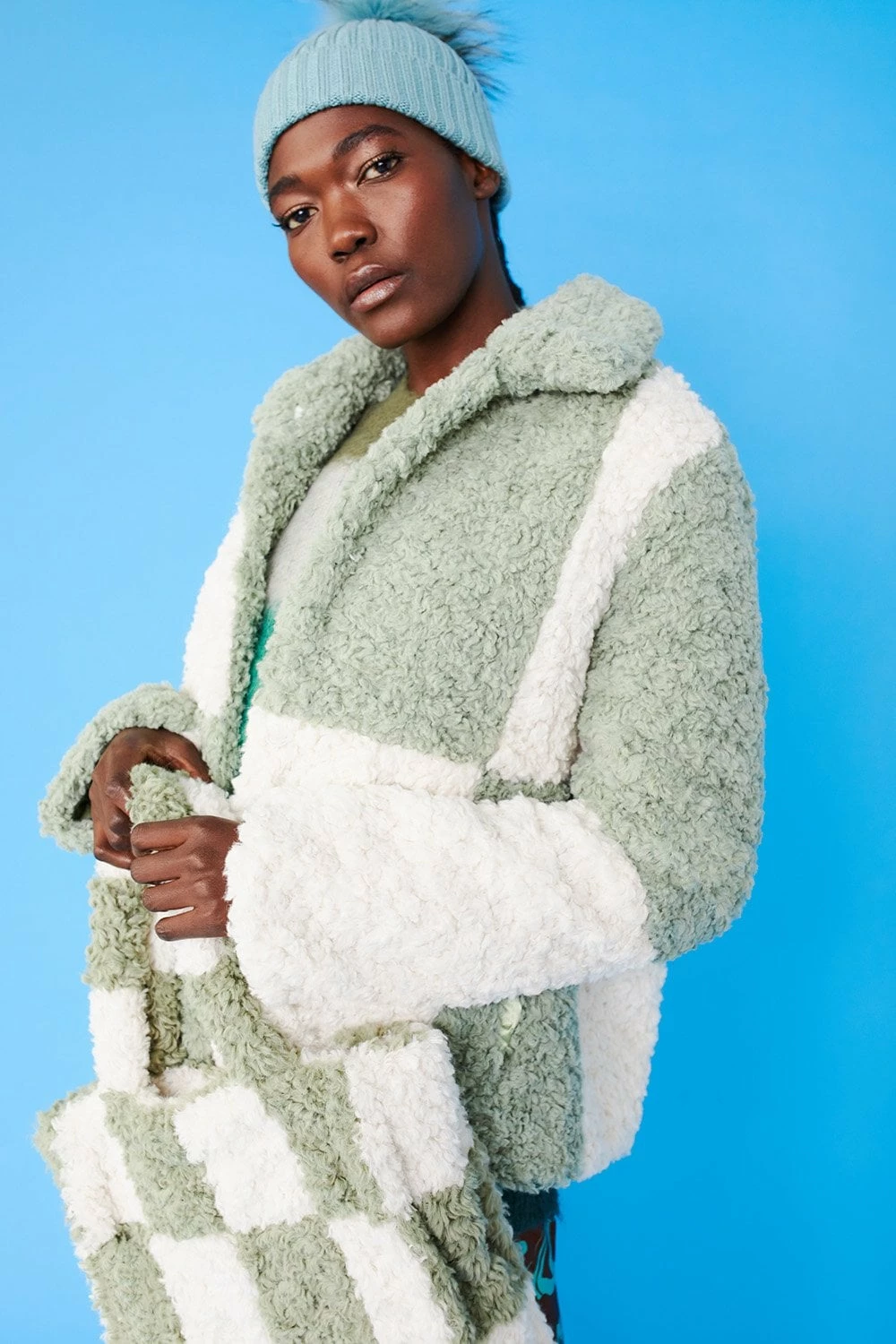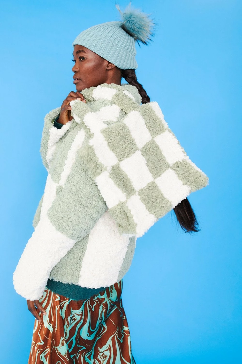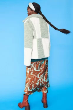 Style and warmth are two of the key features of this fluffy big check monochrome jacket. Made from faux shearling with a collar, pockets, and hook and eye closures.