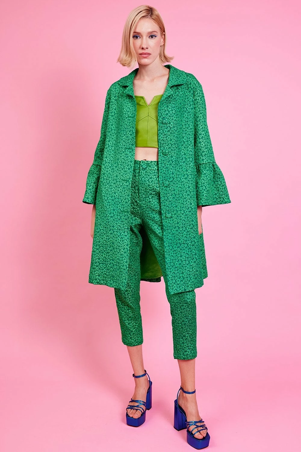 A coat for the limelight. This green trench-style coat is crafted from our softest sustainable material.