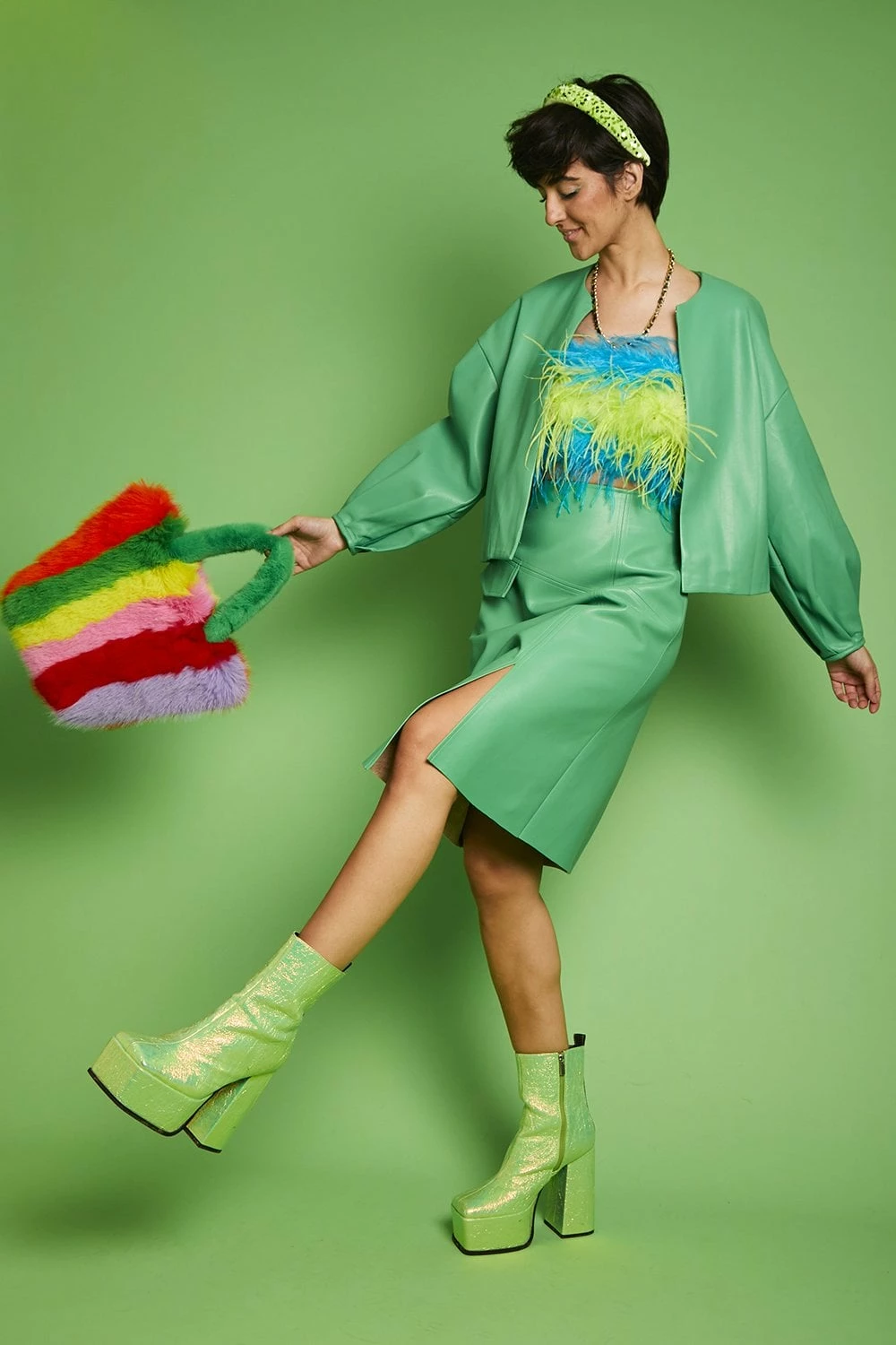 Your transitional wardrobe just got a little sweeter. This green jacket is crafted from our exclusive eco-leather and features gathered cuffs and cut to a flattering cropped length.