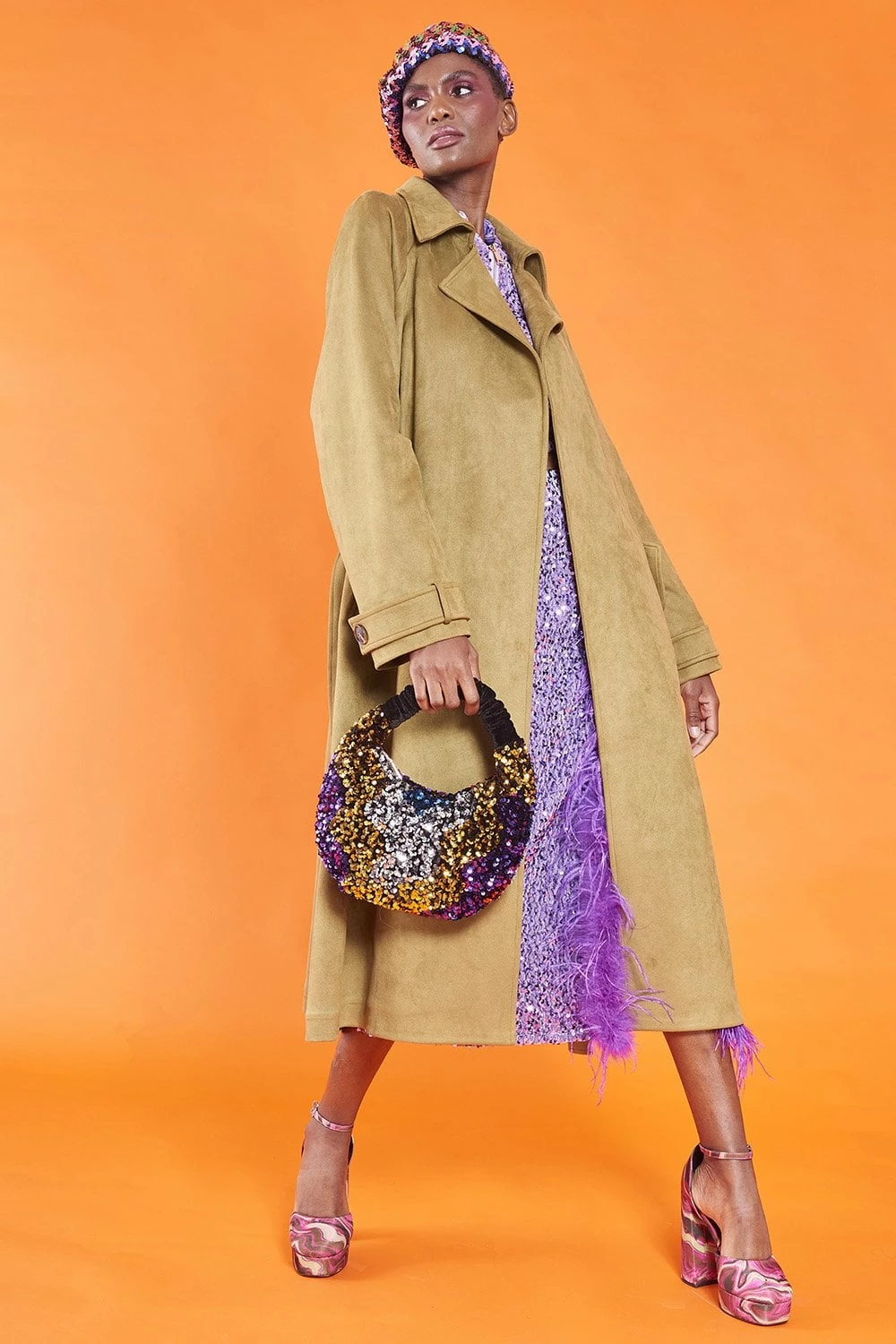 Lightweight and super soft, this green faux suede trench coat is cut to a flattering mid-length, straight shape. This chic twist on the classic trench coat features a tie waist with belt loops and a peak lapel. Classically elegant in a structured fit, perfect for all occasions.
