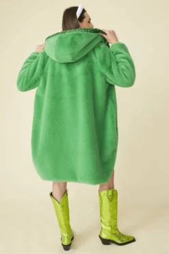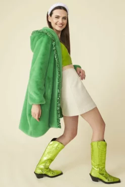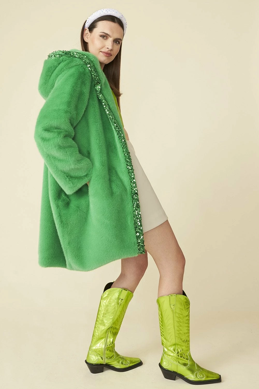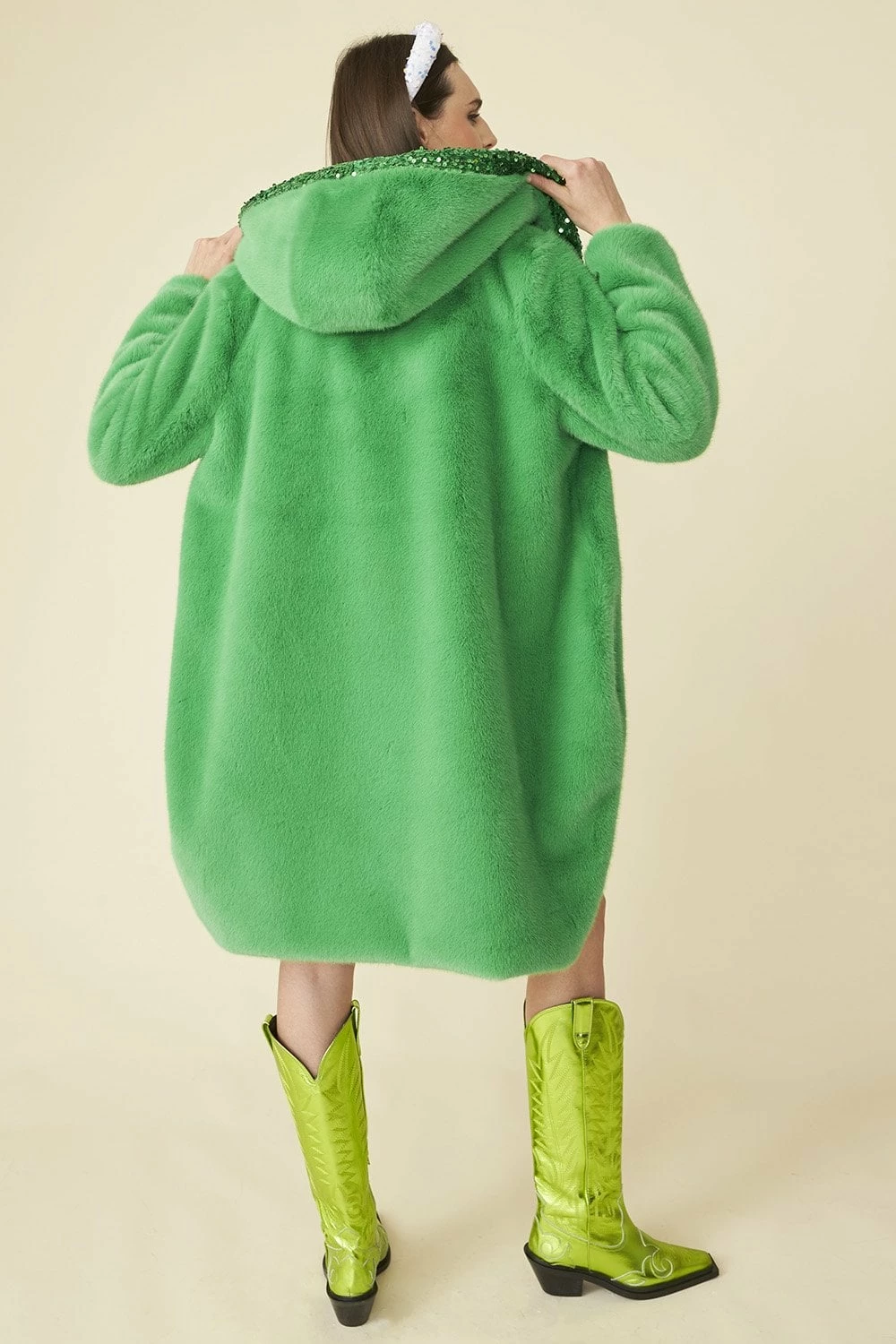 Elevate your festive look with this gorgeous oversized faux fur coat with sequin detail. Featuring a classic collar with sequin trim, drop shoulders, pockets and a huge snuggly hood.