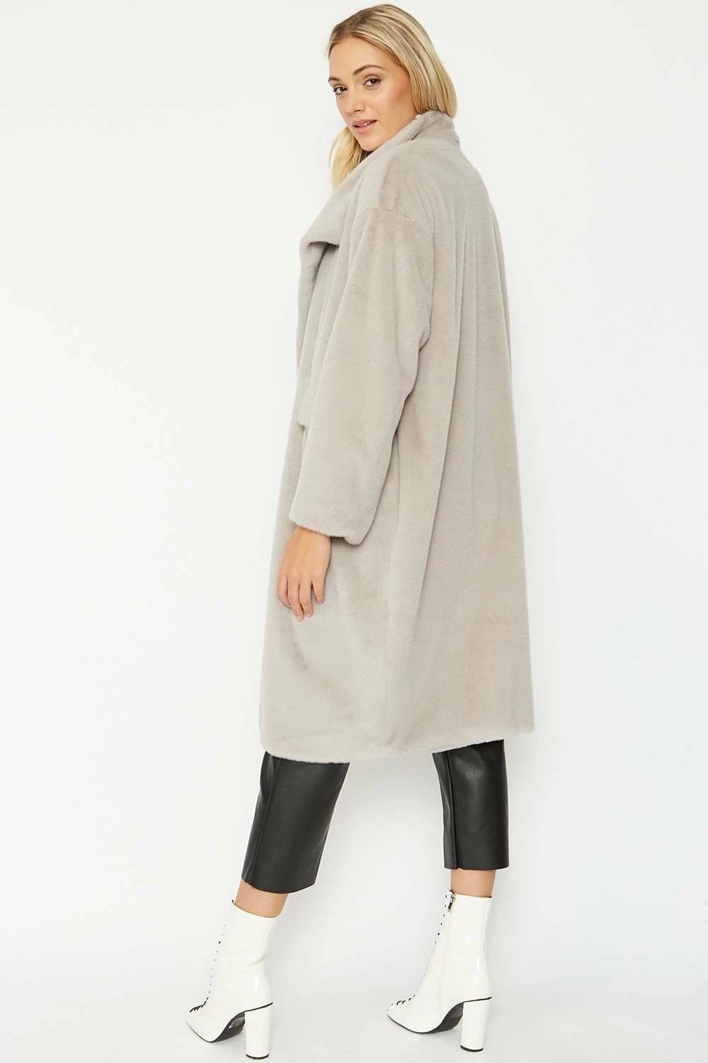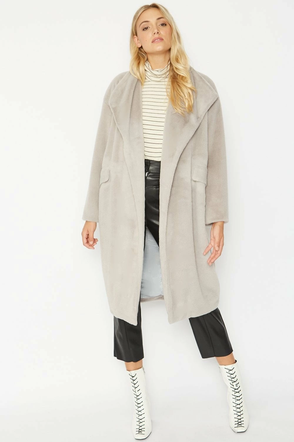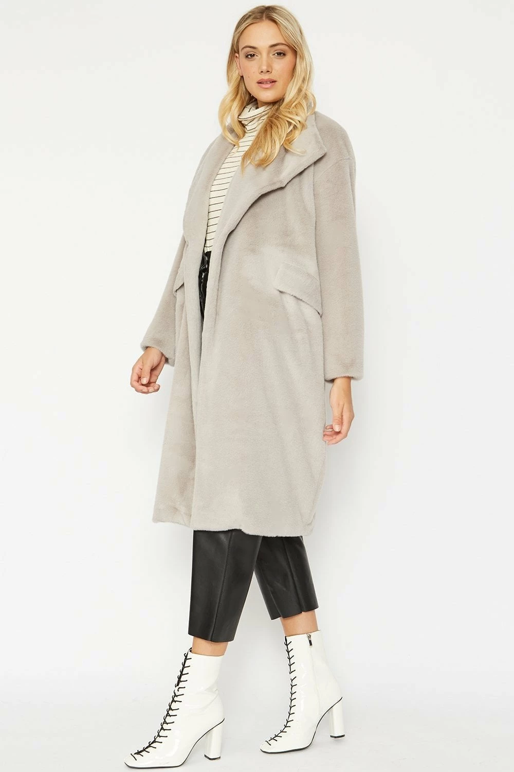 Meet your next favourite faux fur coat! This is an incredibly soft piece that features an exaggerated collar and sumptuously soft side pockets. Cut to a flattering length, this jacket will quickly become your go to outwear piece.