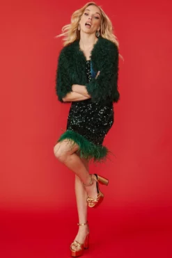 Hand knitted and incredibly soft to touch, this cropped faux fur jacket features full silk lining, hook and eye front fastening and three-quatre length sleeves.