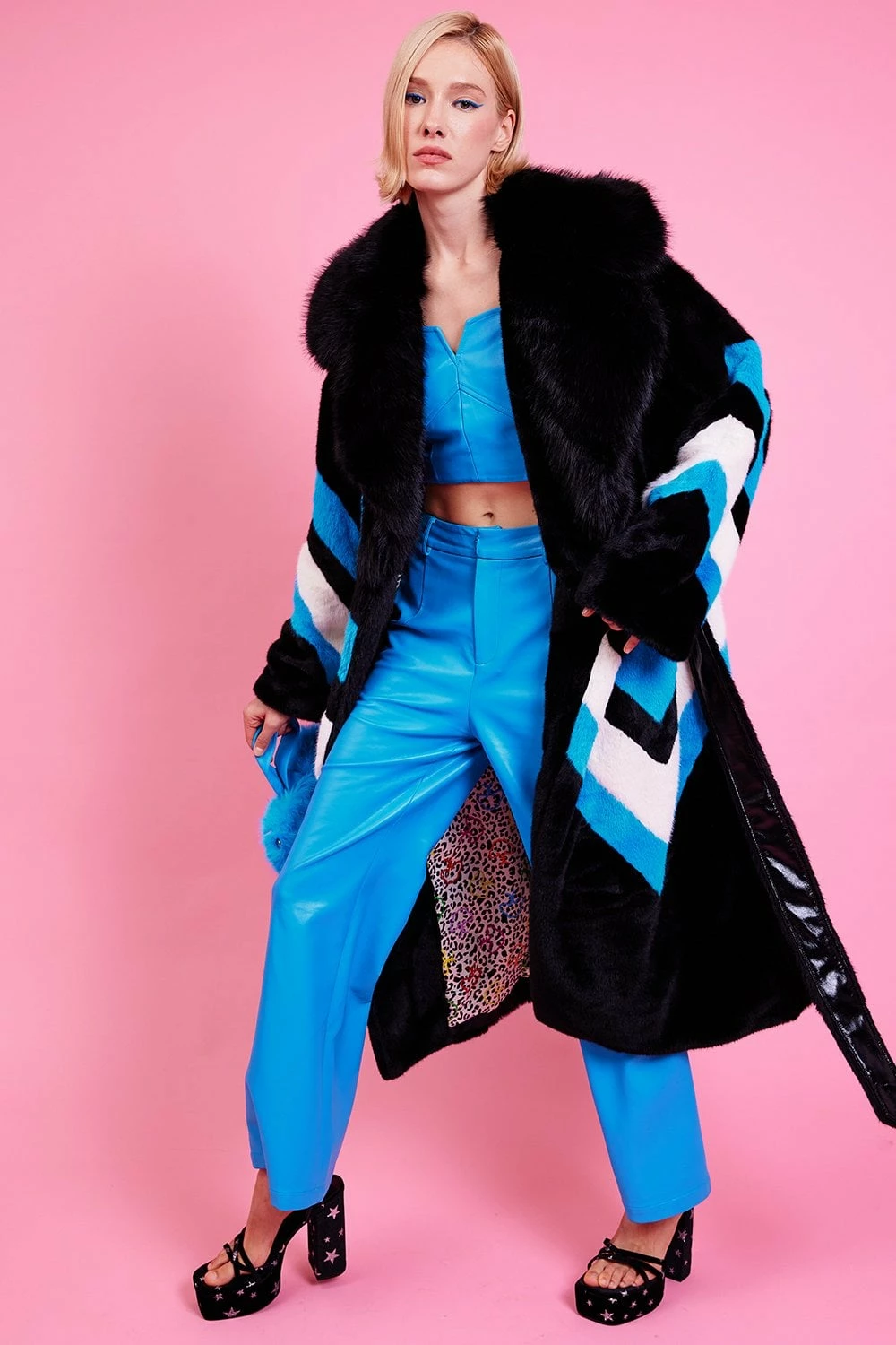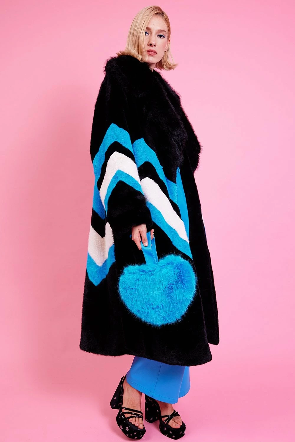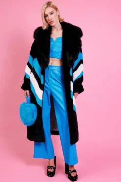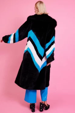 Elevate your look with this gorgeous oversized faux fur coat with bold line detail. Featuring oversized lapels and side pockets. What is not to love?