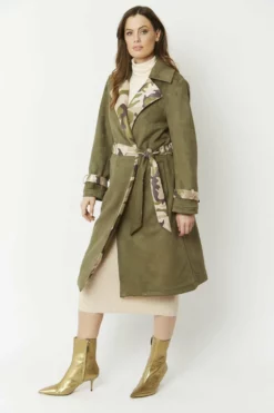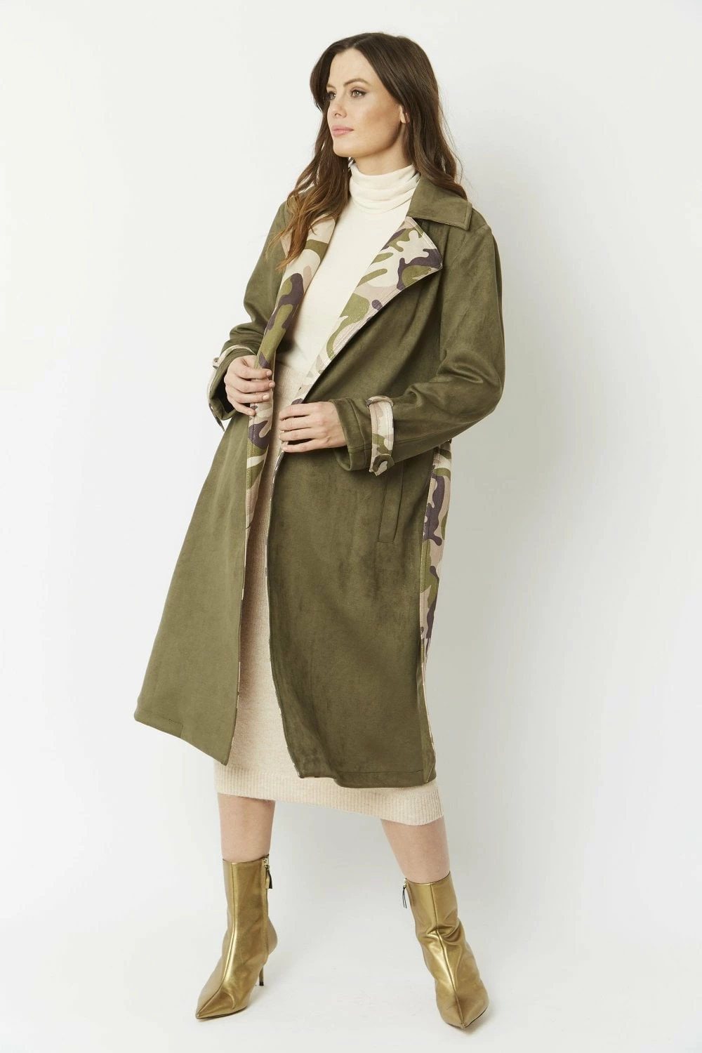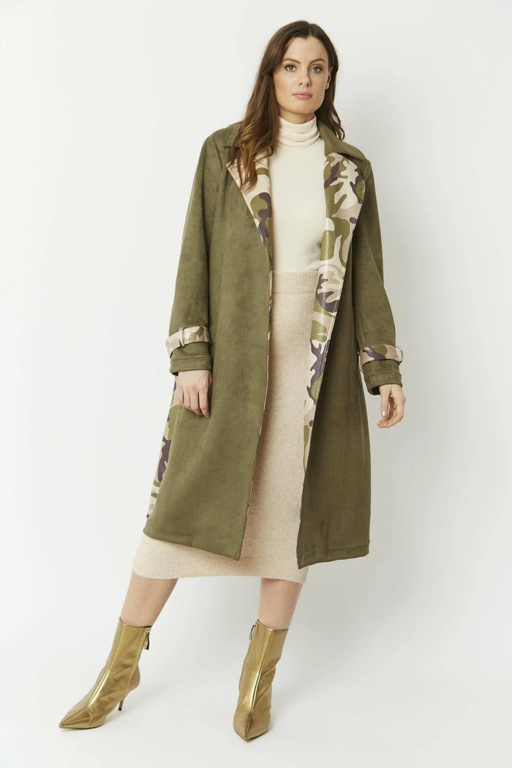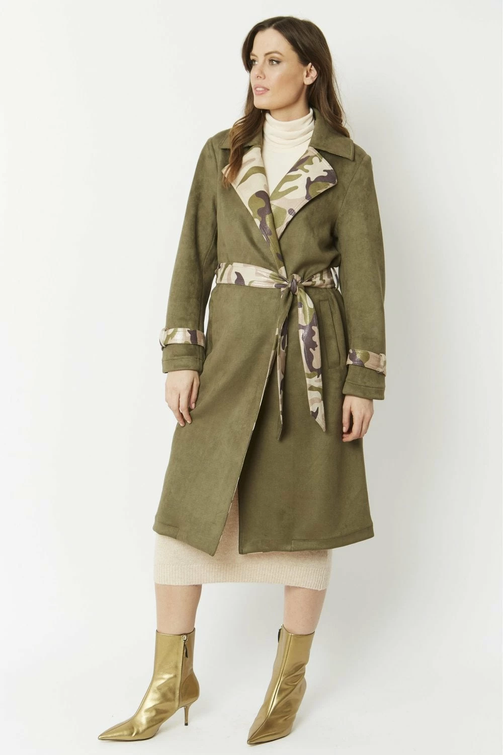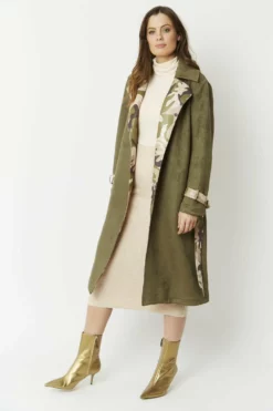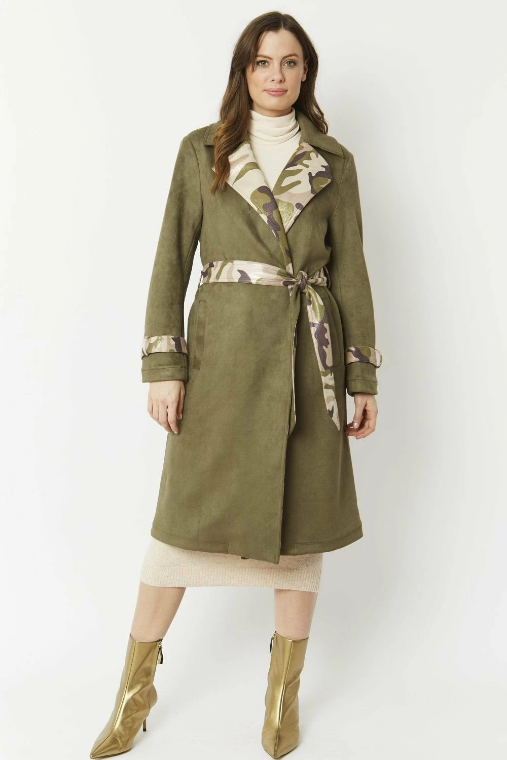 Lightweight and super soft, this camouflage jacket with subtle glitter effect is made of the finest faux suede material and is cut to a flattering mid-length, straight shape. This chic twist on the classic trench coat features a tie waist with belt loops, contrasting belted cuffs and peak lapel and a kick split at the centre back.