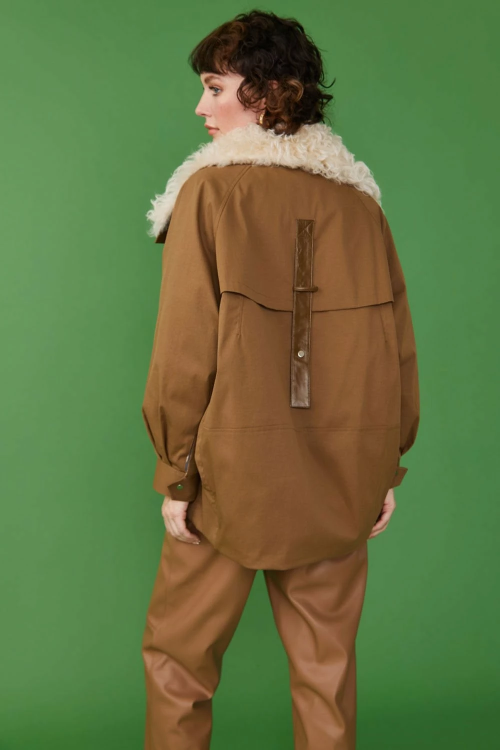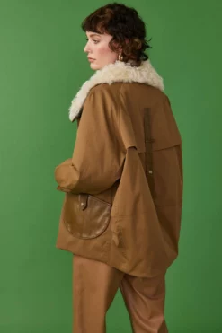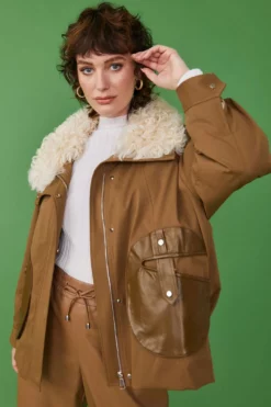 This oversized mocha parka coat with a cream shearling collar is guaranteed to keep you warm and cosy. The contrasting material of the pockets and strap detail on the back adds plenty of interest and updates the look of the classic parka.