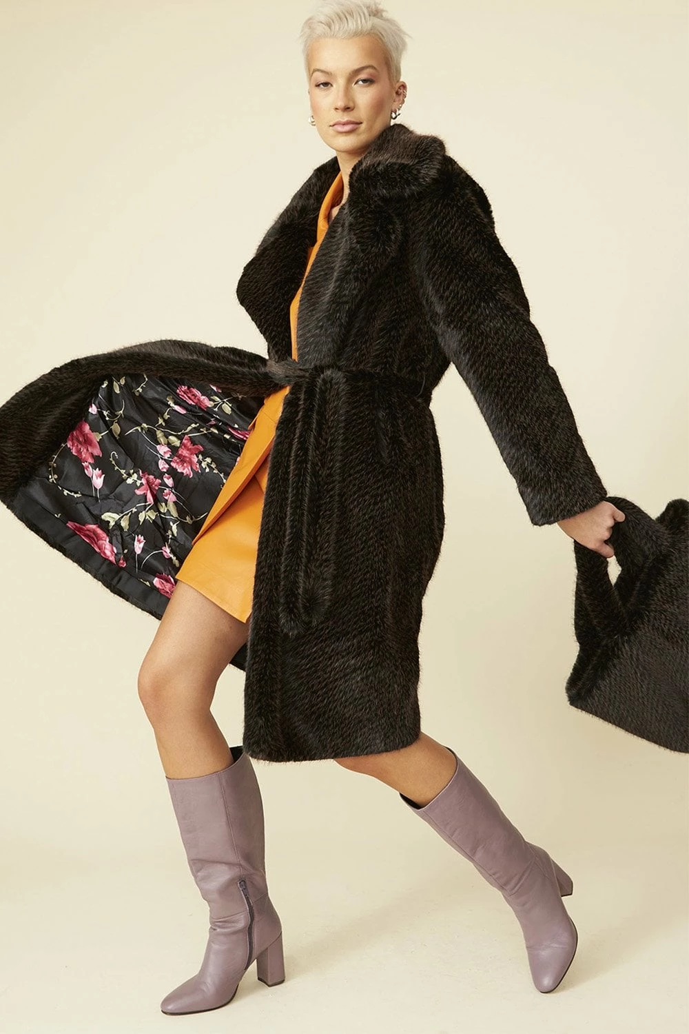 Cut to a flattering mid-length this faux fur coat is a timeless piece that’s associated with glamour and elegance. Featuring side pockets, full lining and peaked lapels, this coat is made to be worn open, and to accentuate your below dress or pair or trousers.