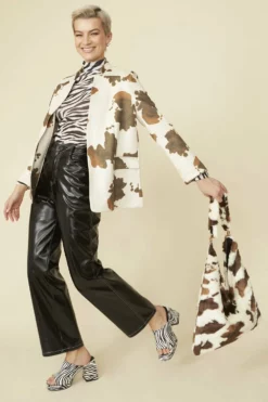 Cowhide Print faux suede trench style jacket with a bold cow print is the perfect companion for your transitional wardrobe. This jacket features an inverted lapel collar.