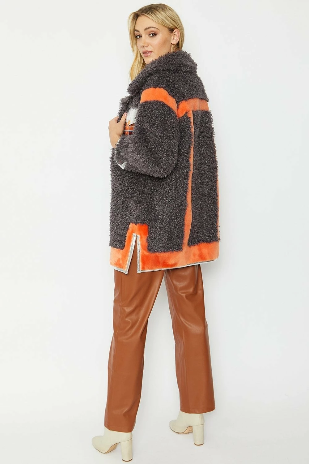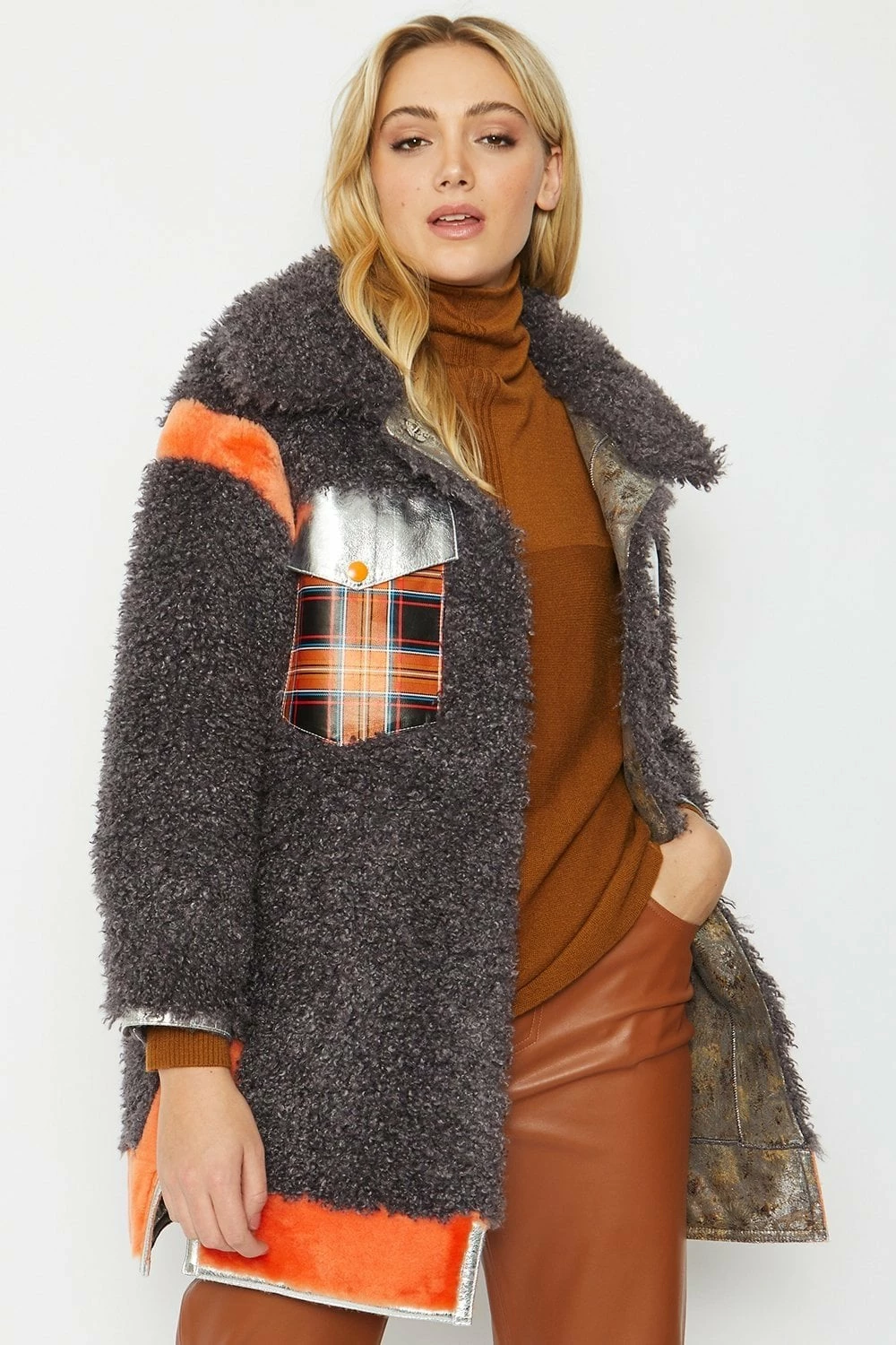 Our Shearling & Leather Coat with its checkered pocket prints and statement silver lining is a wardrobe must-have. With contrasting detailing and colours we know you’ll never be disappointed stepping out in this jacket.