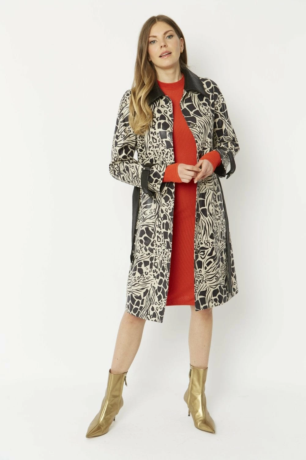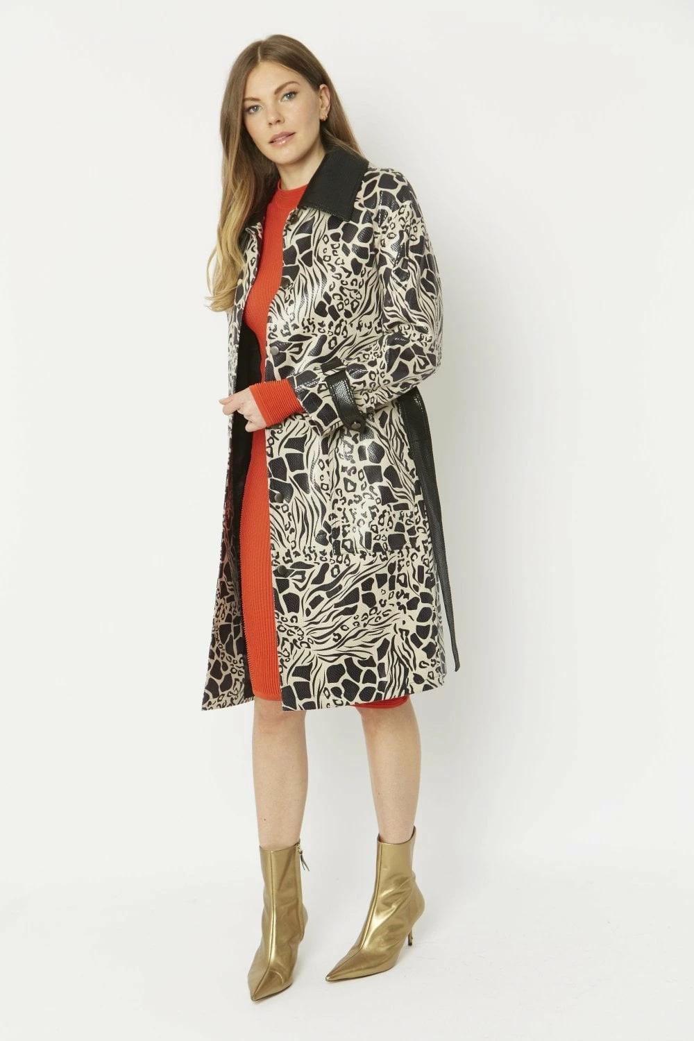 Our Faux Suede Midaxi Coat features a snakeskin base print followed by a contrasting animal print. This coats also features a block black classic collar, button details and black block pocket details and belt to give you that one of a kind stylish look.