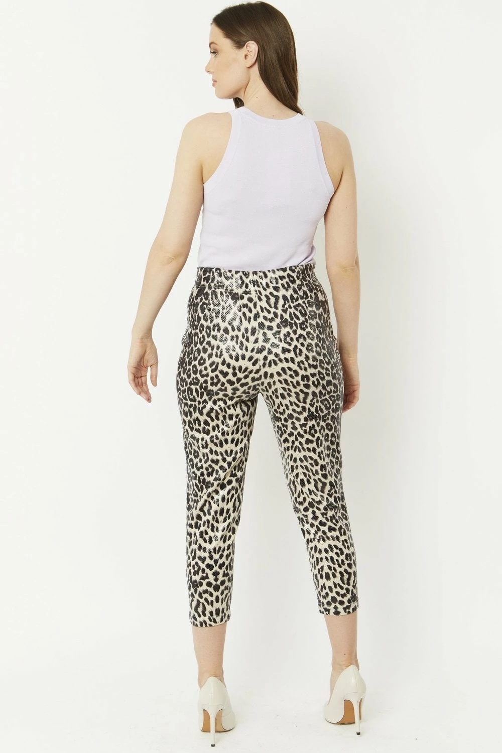 We love these shiny faux suede mid-waist, tapered trousers. With an elasticated waist these trousers are both comfortable and flattering.