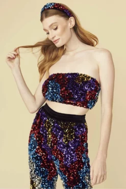Our multi-Coloured velvety embellished flared trousers feature sequin embroidery, a high elasticated waist, silk lining, and pockets. , these trousers are deserving of a moment in the spotlight. Style with statement heels for a truly spectacular ensemble.