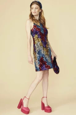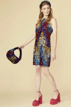 All the party vibes in one outfit! This gorgeous Short Sleeve tunic dress has a high neck and zip back fastening. The sequined are chevron-coloured designs and are sewn to soft and comfortable velvet, allowing you to wear them without any sequin irritation.